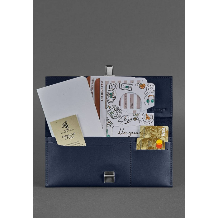 Всередині є кілька відділень для документів і грошей, також є невеликі кишеньки, в яких можна розташувати пластикові карти і візитки. Закривається холдер на стильний портфельний замок.