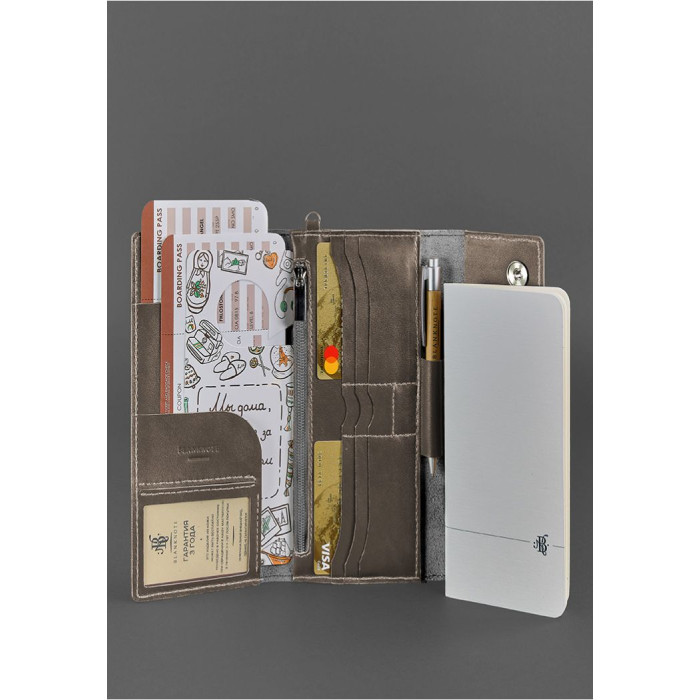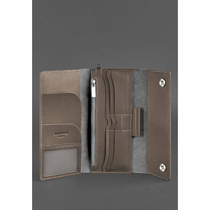 Аксесуар виконаний з міцної високоякісної натуральної шкіри. Усередині є кілька просторих відділень для документів і купюр. Відділення на блискавці допоможе зберегти всі важливі дрібниці. Також є 8 відділень для пластикових карт і одне відділення з прозорим віконцем. Також є кишеньки для sim-карт.