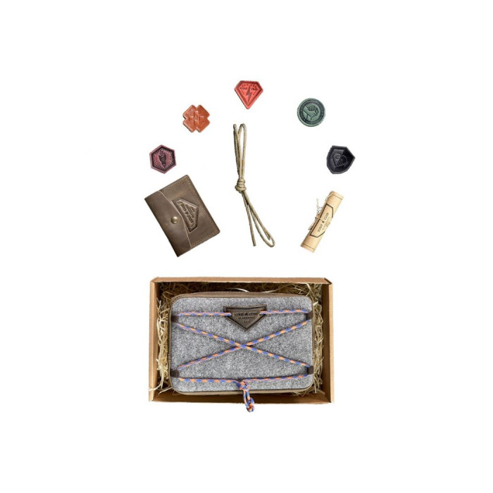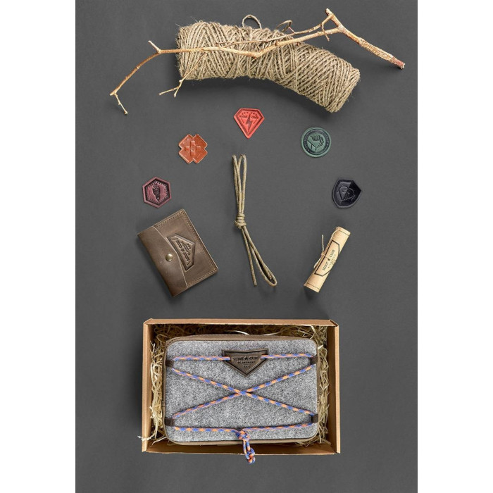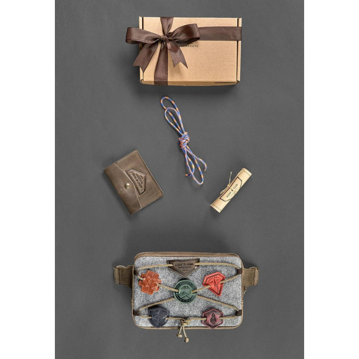 В набір скаута для хлопчика входить: поясна сумка, шкіряний міні-гаманець, набір спеціальних значків і вкладиш із завданнями.