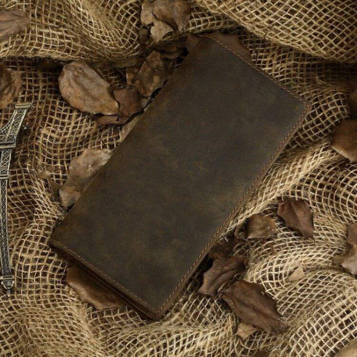 Сучасний, якісний гаманець коричневого кольору. Аксесуар виконано з натуральної вінтажної шкіри, яку прийнято називати Crazy Horse (Крейзі Хорс). Відмінними рисами такої шкіри, є потертості і неоднорідність забарвлення, що надає виробу оригінальність. Гаманець упакований в текстильний пилозахисний чохол білого кольору.