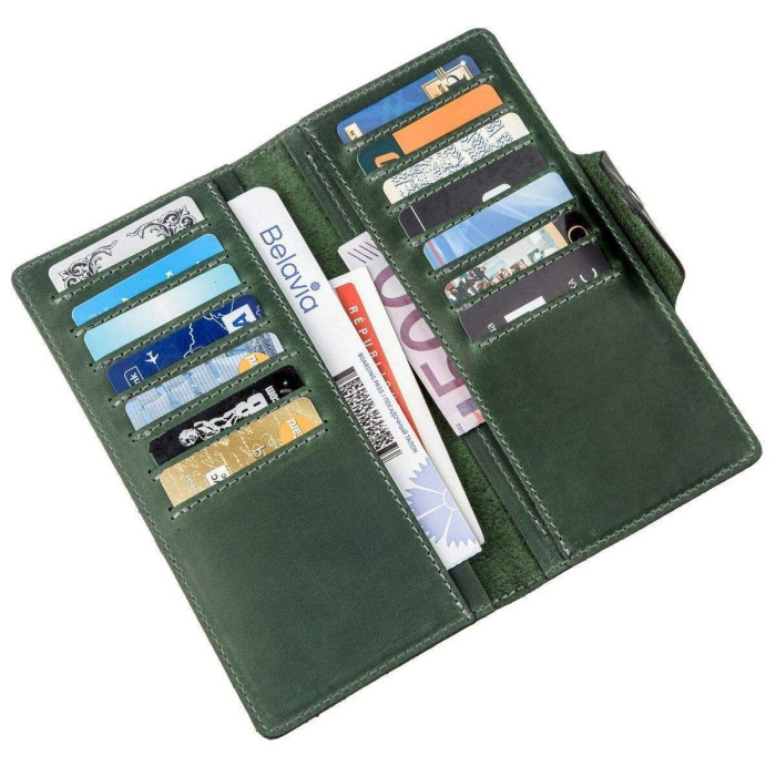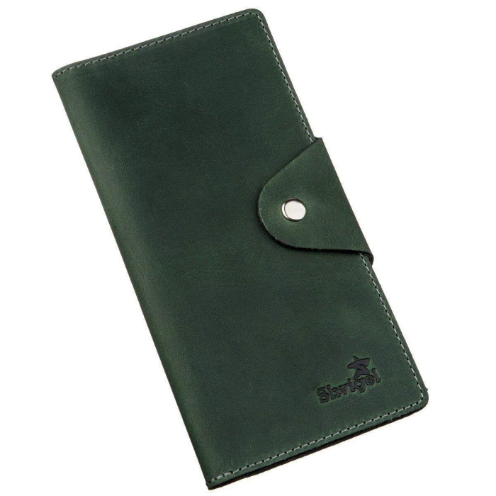 Солідний гаманець з вінтажної шкіри. Аксесуар виконаний в оригінальному зеленому кольорі. Шкіра має матовість, дрібними потертостями і подряпинами. Гаманець прошитий наднадійною ниткою. На лицьовій стороні (в правому нижньому кутку) знаходиться тиснений логотип компанії-виробника SHVIGEL. Аксесуар закривається на кнопку (ближню або дальню) в залежності від його наповненості. Модель доступна в різній шкірі і кольорах