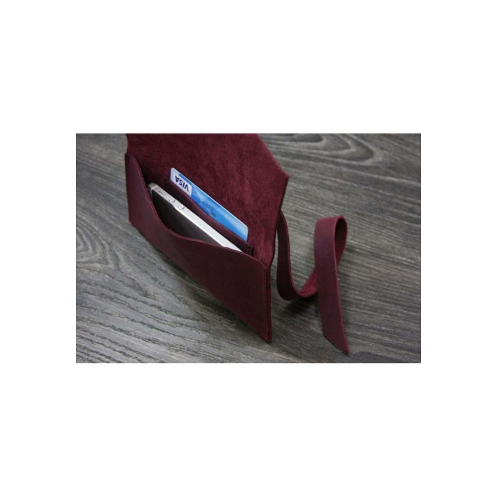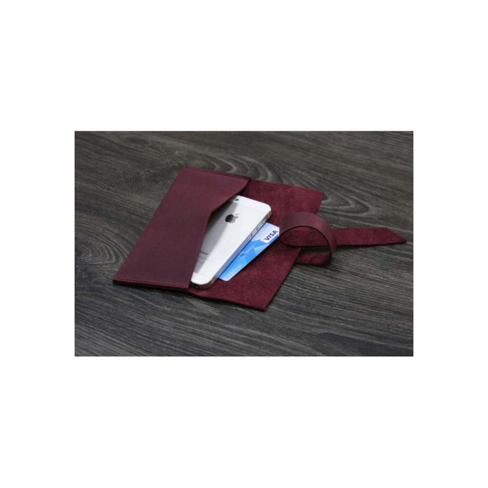 Чохол закривається за допомогою хлястика, всередині два відділення: для смартфона і невелика кишенька для картки.