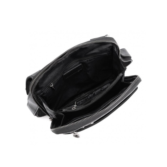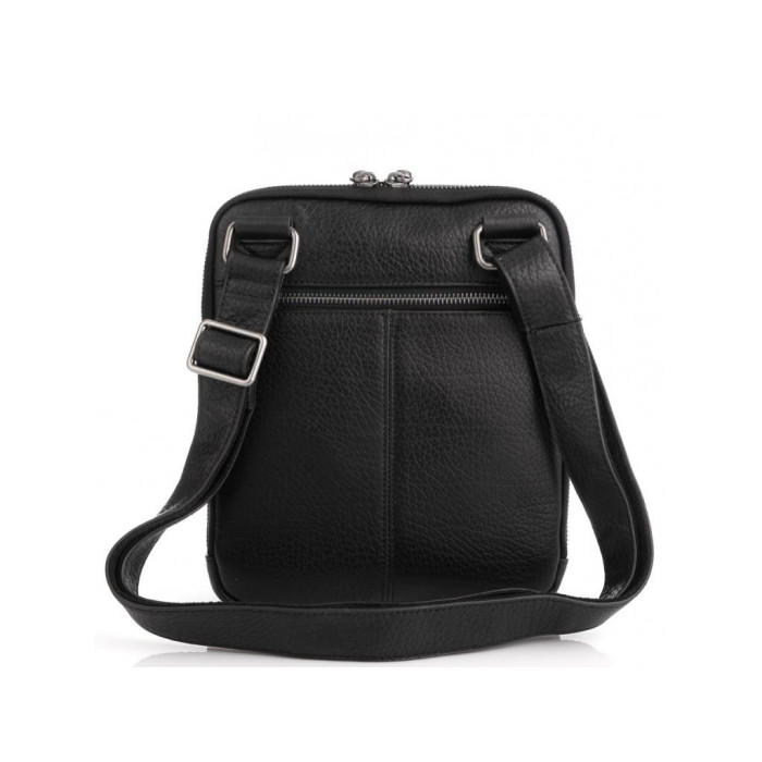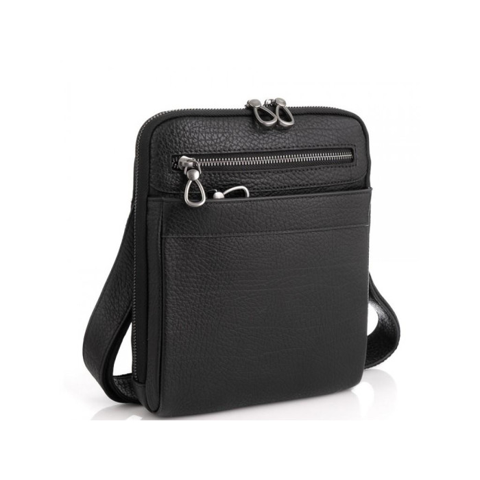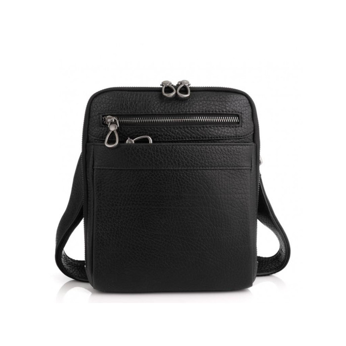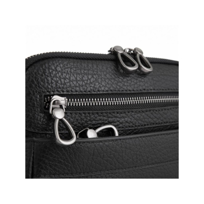 Шкіряна чорна сумка виготовлена з італійської шкіри високої якості. Сумка має шкіряні пуллера, плечовий ремінь верхня частина якого зроблена зі шкіри, нижня з щільного текстилю. Усередині сумки міцна, чорна підкладка. Сумка чоловіча оснащена одним основним відділенням на блискавці, воно розділене кишенею-перегородкою на блискавці, також всередині є кишеня відкритого типу і кишеня на блискавці. З лицьового боку дві кишені на блискавці, з тильного боку також є кишеня на блискавці.
