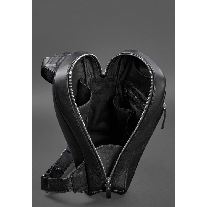 Сумка-слінг має одне відділення, яке закривається на блискавку. Усередині є декілька кишень для дрібниць і одна зовнішня кишеня на передній стінці рюкзака.