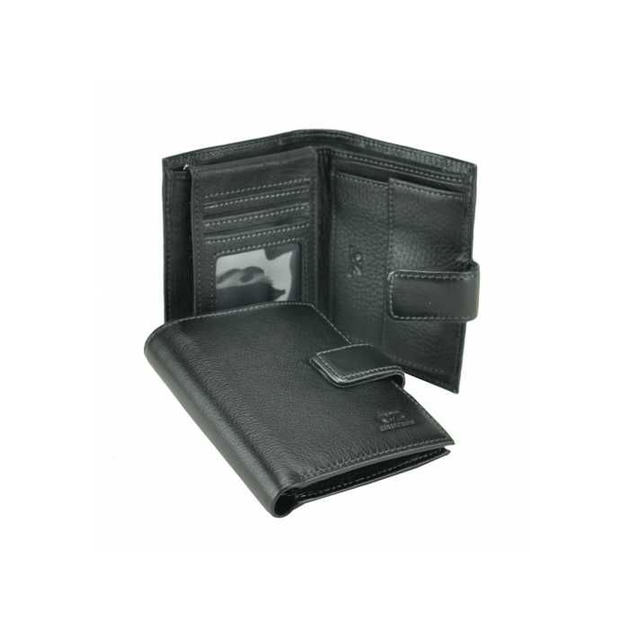 Портмоне від компанії Tiding Bag виконано в чорному кольорі з якісної натуральної телячої шкіри. Чоловічий гаманець подвійного складання закривається за допомогою хлястика на кнопці. У ньому є одне велике відділення для купюр. З одного боку аксесуара розташована монетниця на кнопці, а з іншого - кілька кишеньок для пластикових карт. Це портмоне має додатково кишеню-клапан посередині, в якому, крім відділів для візиток, є прозорий слот для документів. Міцність, надійність і компактність - основні якості даної моделі чоловічого гаманця.