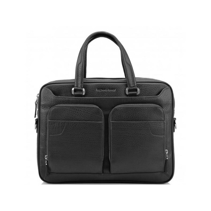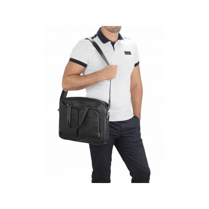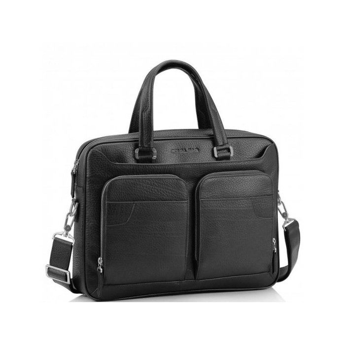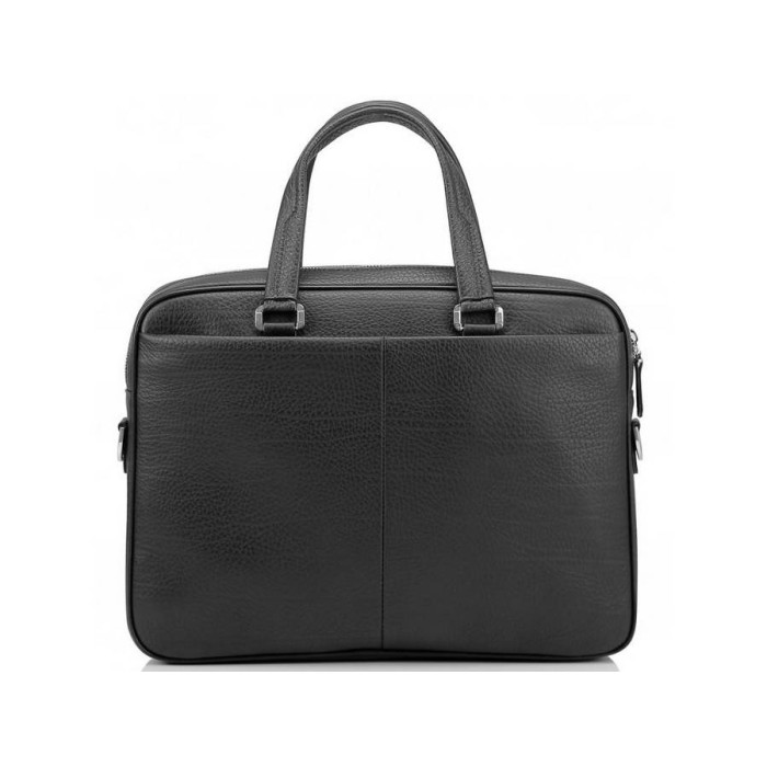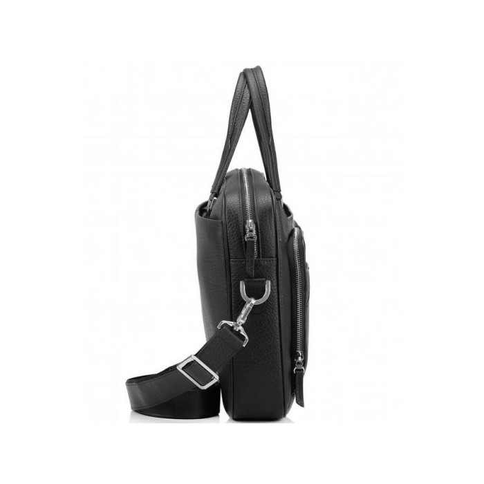 Зручна чоловіча сумка виконана з натуральної шкіри чорного кольору з зернистою поверхнею. Сумка для ноутбука має шкіряні ручки для носіння і наплечну шлейку з шкіри ущільнену текстильною підкладкою. В основному відділенні достатньо місця для документів, паперів і ноутбука з діагоналлю до 14 дюймів. Чоловіча сумка має одне основне відділення на блискавці. З лицьового боку відділ горизонтального формату на блискавці і дві накледні кишені також на блискавці, з тильного боку відділ горизонтального формату на блискавці. Усередині сумки 3 кишені відкритого типу.