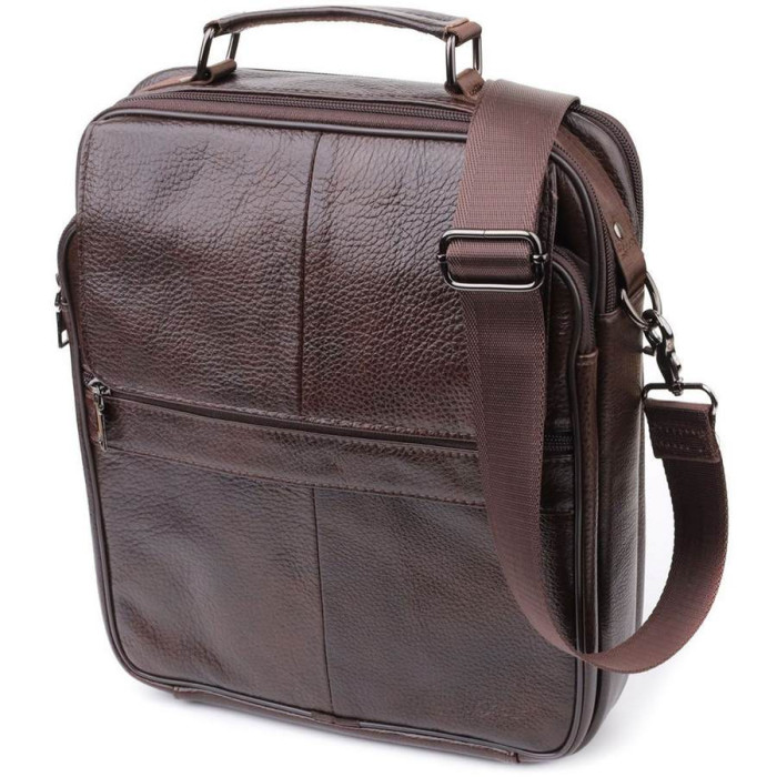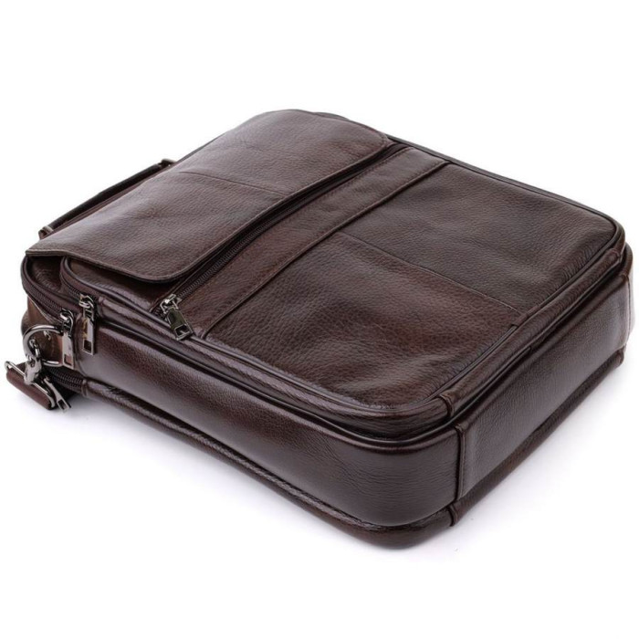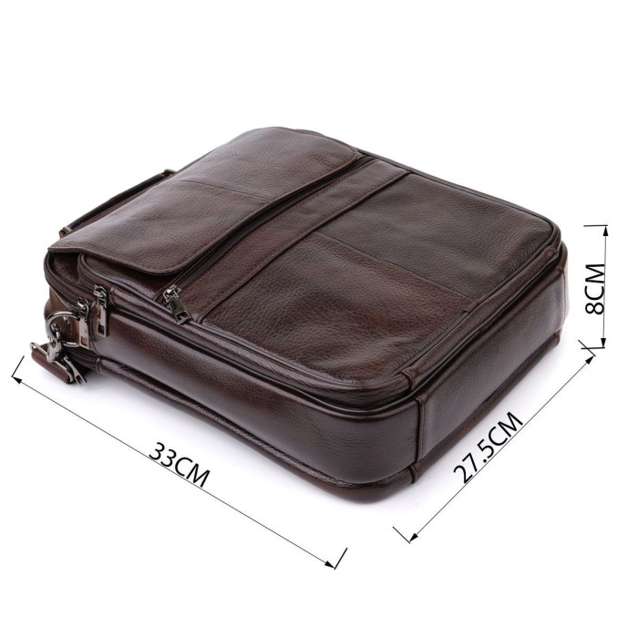 Чоловіча шкіряна сумка виконана з високоякісної натуральної шкіри та поєднує в собі функціональність та стиль. Модель оснащена двома основними відділеннями на блискавці, одне з яких включає таємну кишеню на блискавці на задній стінці для надійного зберігання важливих дрібниць.