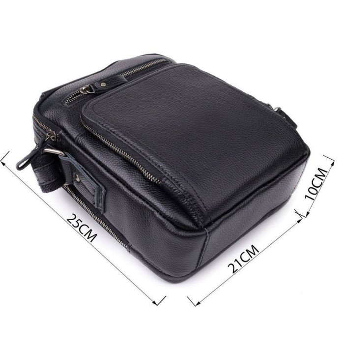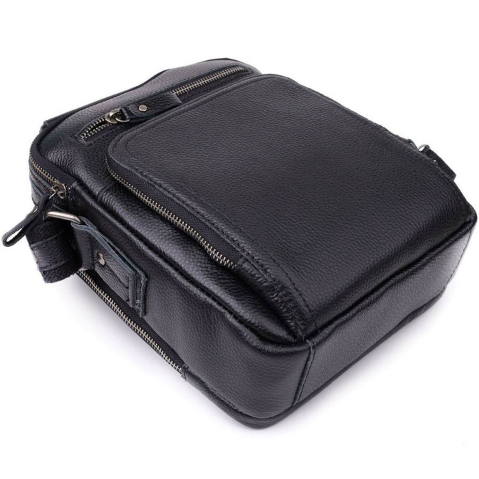 Чорна шкіряна сумка на плече – практичний та стильний аксесуар для повсякденного використання. Модель виконана з натуральної зернистої шкіри флотар, стійка до зношування та зберігає акуратний зовнішній вигляд. Оснащена двома основними відділеннями на блискавці, в одному з яких передбачена потайна кишеня. На лицьовій стороні розміщено накладну кишеню на блискавці та горизонтальну вбудовану кишеню. На тильній стороні — зручна кишеня на блискавці. Сумка доповнена міцною шкіряною ручкою та регульованим незнімним шкіряним ремінцем для носіння на плечі. Фурнітура кольору срібла надає моделі стриману елегантність.