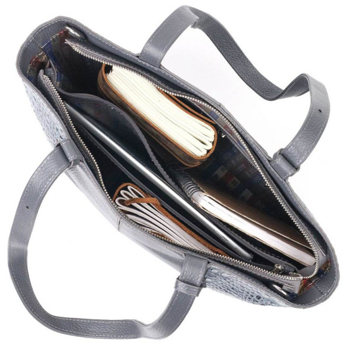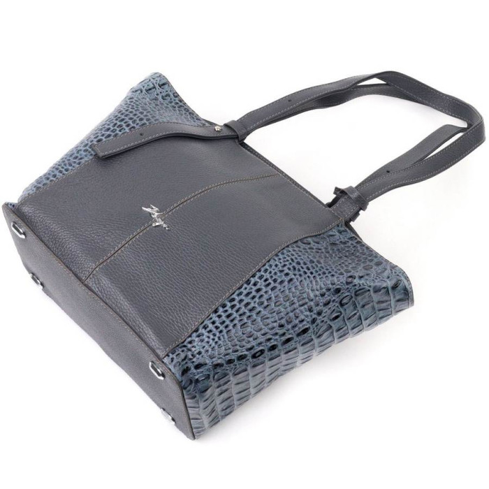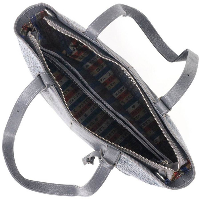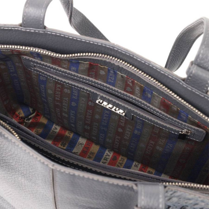 Добротна сумка жіноча з натуральної фактурної шкіри з тисненням під змію і вставкою з дрібнозернистої натуральної шкіри. Сумка функціональна та зручна в експлуатації, якісна фурнітура не тільки доповнює стильний дизайн сумки, але й захищає виріб. Аксесуар упакований у фірмовий текстильний мішок Karya.