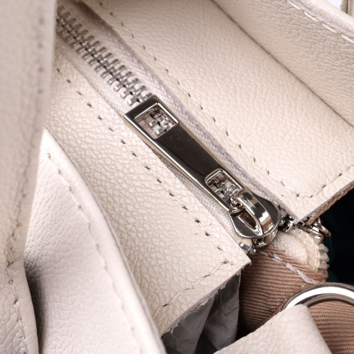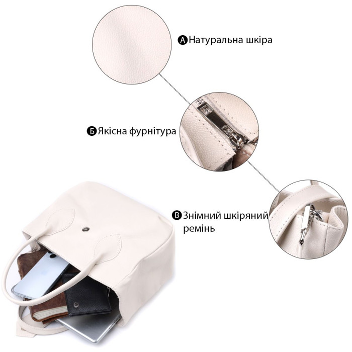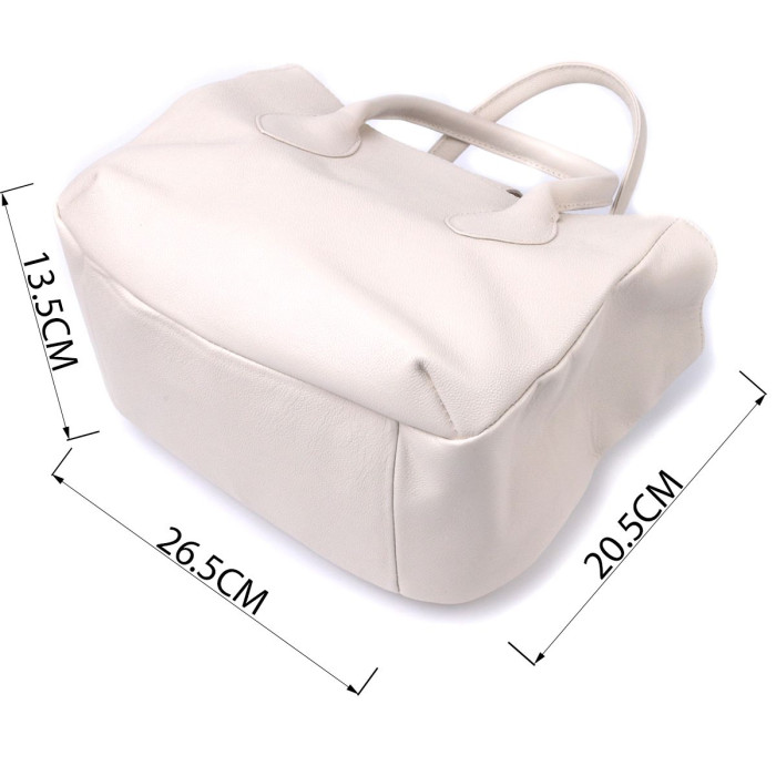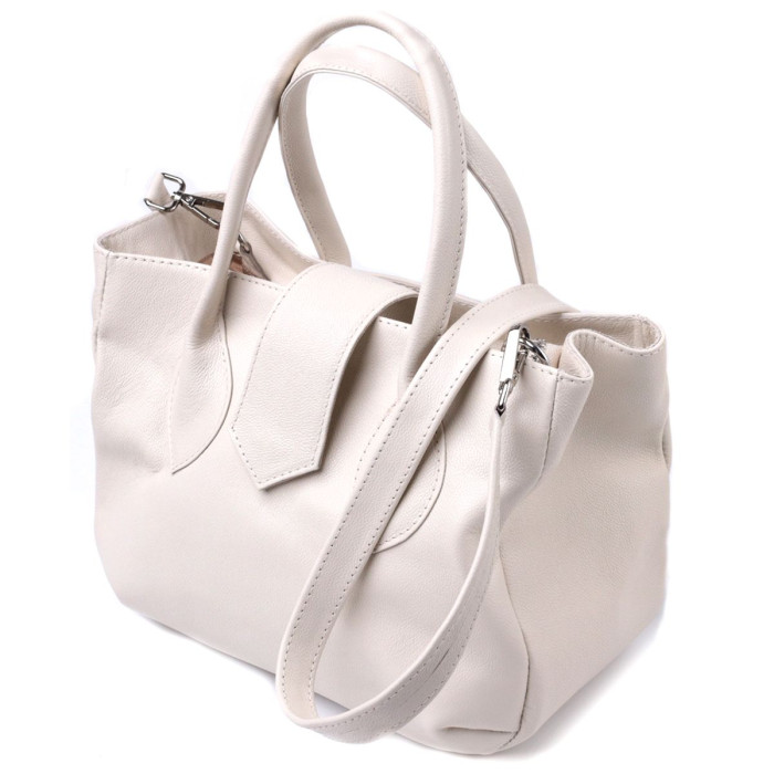 Жіноча сумка для тих, хто любить красивий дизайн без зайвих деталей. Така сумка стане надійним супутником для сучасної жінки, яка любить не лише стильні речі, а й функціональність. Колір виробу – благородний бежевий, фактура – зерниста. Матеріал виконання – натуральна шкіра з високими показниками якості. Носити сумку можна в руках і на плечі для цього передбачені дві міцні шкіряні ручки і регульований знімний плечовий ремінь. Відмінний варіант сумки на кожен день, адже вона не тільки приваблива зовні, але й оснащена розумною системою внутрішніх відділень, що дозволить організувати простір усередині. Також у виробі використано якісну фурнітуру срібного кольору.