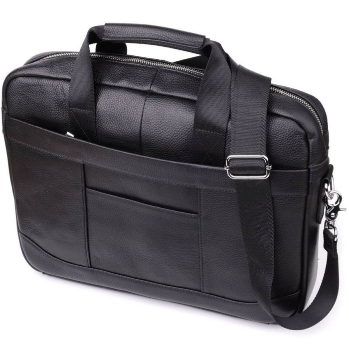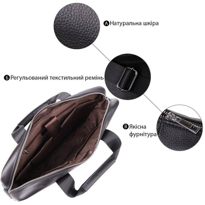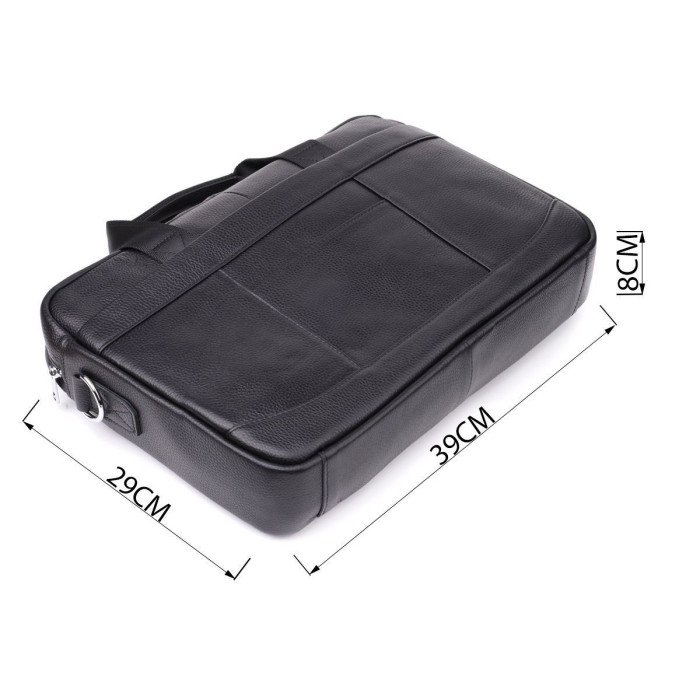 Стильний і функціональний шкіряний портфель чорного кольору, виготовлений з натуральної шкіри з міцним каркасом, ідеально підійде для ділових людей, які цінують комфорт та порядок. Сумка надійно зберігає форму та забезпечує захист вмісту, включаючи ноутбук до 15 дюймів та документи формату А4.