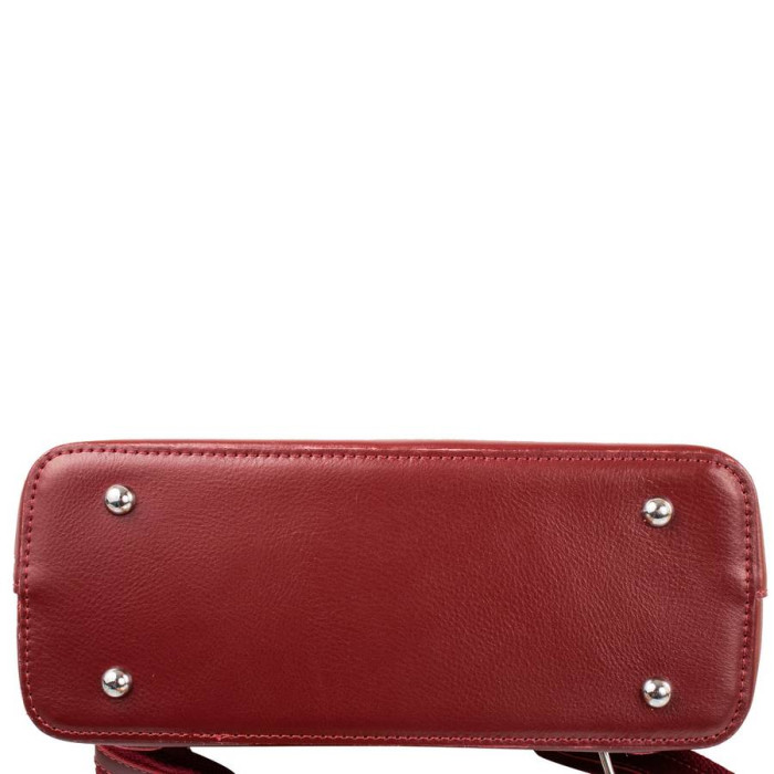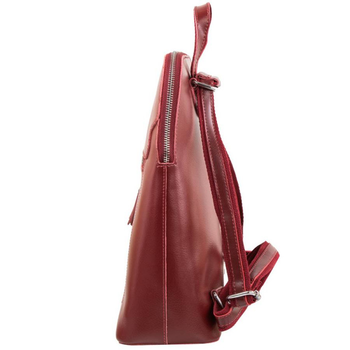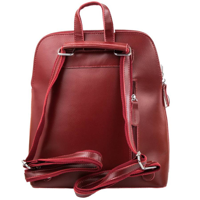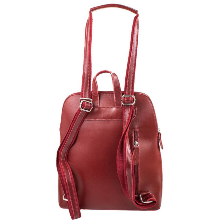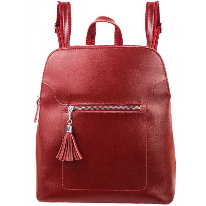 Кількість основних відділень: 1. Всередині є 1 прорізна кишеня на блискавці і накладну. На лицьовій стороні виробу є прорізна кишеня на блискавці. На тильній стороні розташована прорізна вертикальна кишеня на блискавці. Модель має дві незнімні плечові лямки. Довжину лямок можна регулювати за допомогою спеціальних металевих пряжок. У рюкзака є незнімна коротка ручка стабільної довжини. Аксесуар можна носити в руці, на плечі, за спиною. Дно виробу ущільнене і має металеві ніжки. Підкладка виготовлена з щільної тканини. Матеріал: шкіра. Колір: темно-червоний. Колір фурнітури: срібло. Розміри: 28 (замір по дну) *32 *11 см. Модель закривається за допомогою блискавки. Документи формату А4 поміщаються в рюкзак. Виріб упаковано в поліетиленовий пакет. Країна походження ТМ Eterno — Україна, а країна-виробник - Китай. Гарантія: 3 місяці.