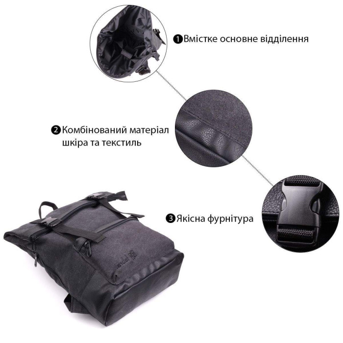 Місткий рюкзак для ноутбука кольору антрацит з конструкцією Rolltop, що дозволяє збільшити місткість виробу. Висота виробу у складеному вигляді 40 сантиметрів, у розкладеному – 53 сантиметри. Аксесуар виготовлений з якісного матеріалу - поліестеру, знаменитого своєю міцністю та зносостійкістю. Також у рюкзаку присутні акценти з еко-шкіри, які надають виробу більш стильного вигляду. На лицьовій стороні, у правому нижньому кутку, розташований вишитий логотип бренду, що є запорукою якості. Усередині знаходяться два відділення: одне з них для ноутбука діагоналлю до 15,6 дюймів з ущільненою стінкою. Зовні: накладна горизонтальна кишеня на блискавці на лицьовій стороні та вертикальна бічна кишеня на блискавці. Носити рюкзак можна в руці, для цього призначена текстильна ручка, а також на спині, для цього є ущільнені лямки та ущільнена спинка для більшої зручності. Фурнітура яка використовується в аксесуарі, якісна, прослужить не один рік, рядки рівні, акуратні краї, підкладка міцна. Відмінний рюкзак як на кожен день, так і в подорожі, яка прослужить Вам не один рік і радуватиме око своїм первісним виглядом.