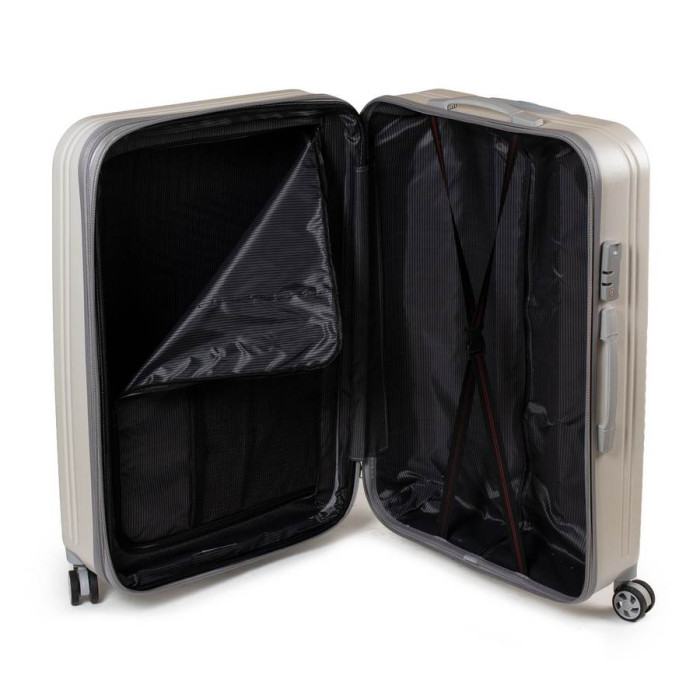 Пластиковий чемодан, виконаний з міцного ABS пластику. Закривається на блискавку з кодовим замком. Обсяг валізи можна збільшити використовуючи блискавку розширення (збільшує глибину валізи на 3 см.). 4 поліуретанових подвійних колеса. Усередині валізи є подвійний відділення з кишенею-перегородкою на блискавці для дрібних речей і стяжки-гумки для фіксації багажу.