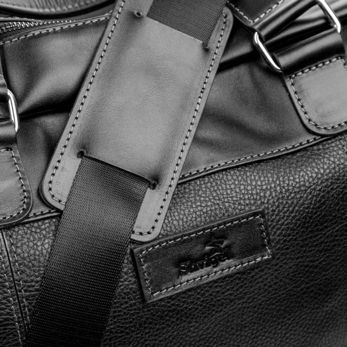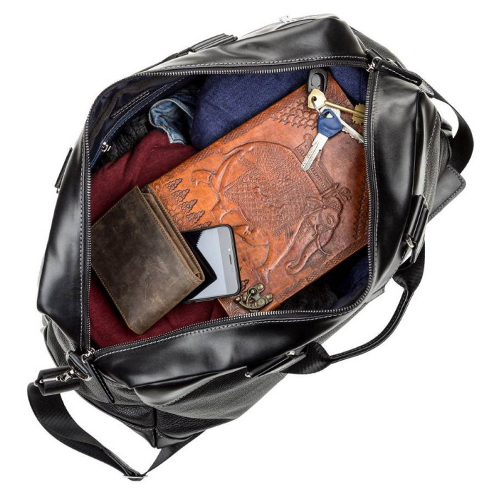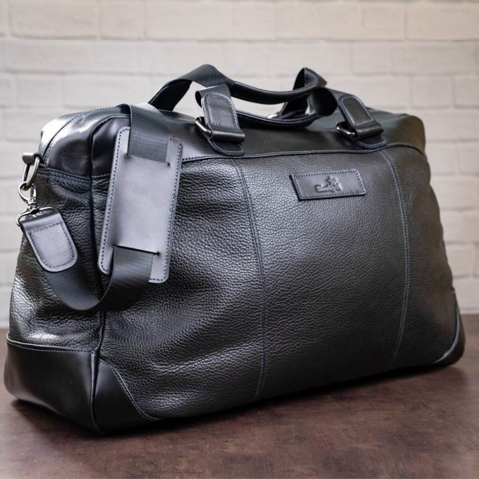 Міцна дорожня сумка на двох ручках для людей, які часто відправляються в ділові поїздки. Виріб виконаний з натуральної зернистої шкіри з елементами гладкої шкіри. Всередині велике вмістке відділення, з боків, на стінках відділення на блискавках. Ззовні відділення на змійці на задній стінці сумки.