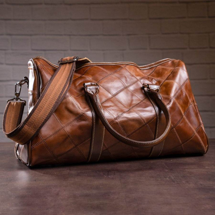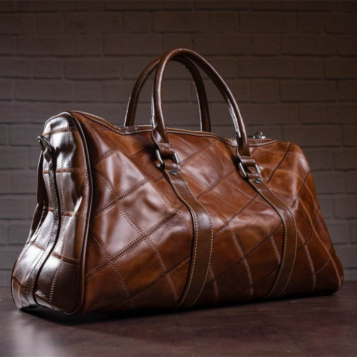 Дуже вмістка і зручна дорожня сумка. Відмінно підійде в зал. На лицевій стороні сумка прошита коричневою ниткою. Аксесуар доповнено фурнітурою сріблястого кольору з міцного металу. Внизу сумки є металеві ніжки. Сумку можна носити як в руках, є 2 шкіряні ручки, так і на плечі за допомогою ременя. Ідеальний варіант для стильних чоловіків і жінок. Сумка буде прекрасним подарунком для близької людини. Модель упакована в тканинної чохол.