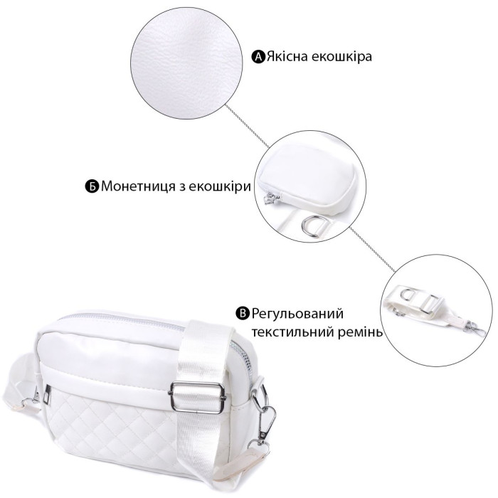 Жіноча стьобана сумка кросс-боді з якісної екошкіри, яка є альтернативою натуральній шкірі. Ця модель доповнена гарним брелоком-монетницею, який чіпляється на ремінець - це дуже зручно, тому що можна в нього покласти ключі, монети та інші дрібниці, які не потрібно буде діставати з сумки. Екошкіра - високоякісна альтернатива натуральному матеріалу, яка дуже стійка до тертя, до низьких температур, відмінно носиться на відміну від інших штучних матеріалів, а також має гіпоалергенний склад на відміну від натуральної шкіри. Ідеальна сумка для жінок та дівчат на кожен день.