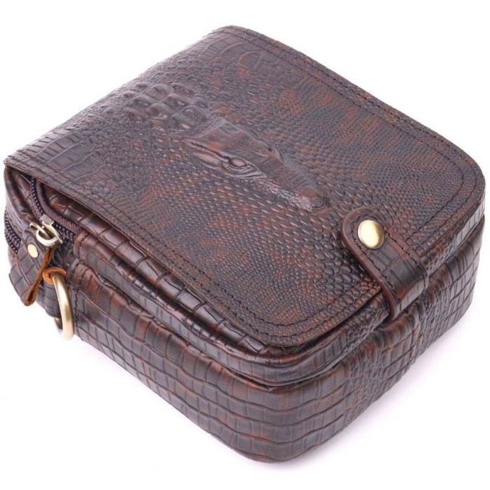 Модна чоловіча сумка з натуральної фактурної шкіри з тисненням під крокодила. Модель, яка ідеально підійде на кожен день. В аксесуарі одне основне відділення та дві кишені різних розмірів, сумку можна носити на плечі. Основним акцентом у цій сумці є декор у вигляді голови крокодила, зовні. Доповнено виріб якісною фурнітурою жовтого кольору. Сумка стане чудовим подарунком для близької людини.