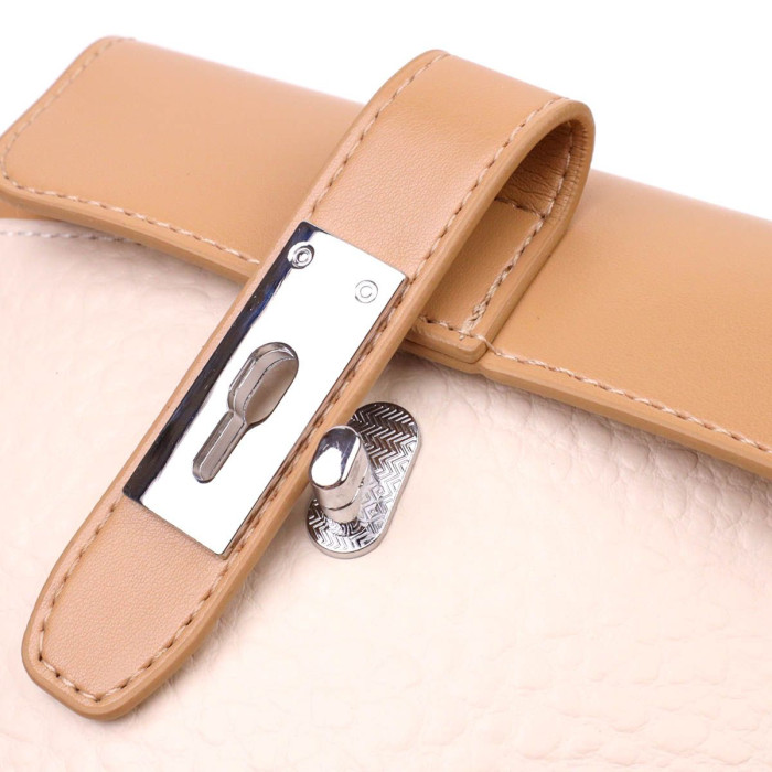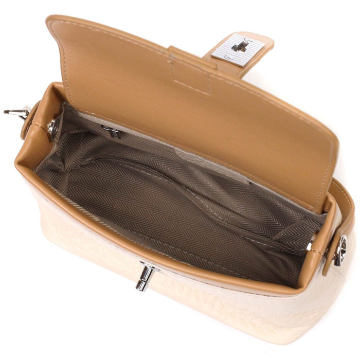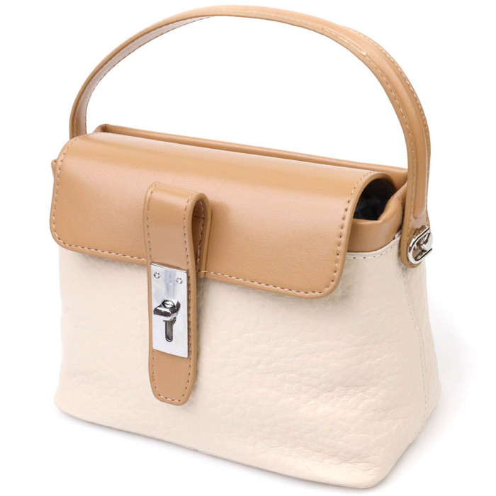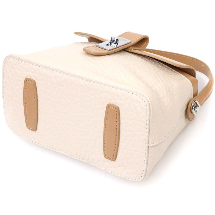 Каркасна сумка жіноча з натуральної фактурної шкіри високої якості в красивому молочному кольорі.. Модель доповнена фурнітурою кольору срібла. Аксесуар має одне основне відділення у якому кишеня на блискавці. Закривається модель клапаном на механічну застібку. Ідеальний варіант для будь-якої дівчини на будь-який сезон.