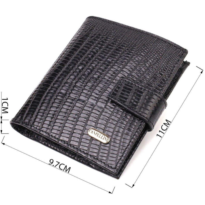 Модний компактний чоловічий гаманець із натуральної фактурної шкіри із тисненням. Аксесуар має основне відділення з перегородкою, п'ять відсіків для карток, дві прилеглі кишені, прозору кишеню для документів та монетницю. Закривається аксесуар хлястиком на кнопку. Відмінний аксесуар від надійного виробника, що прослужить дуже довго.