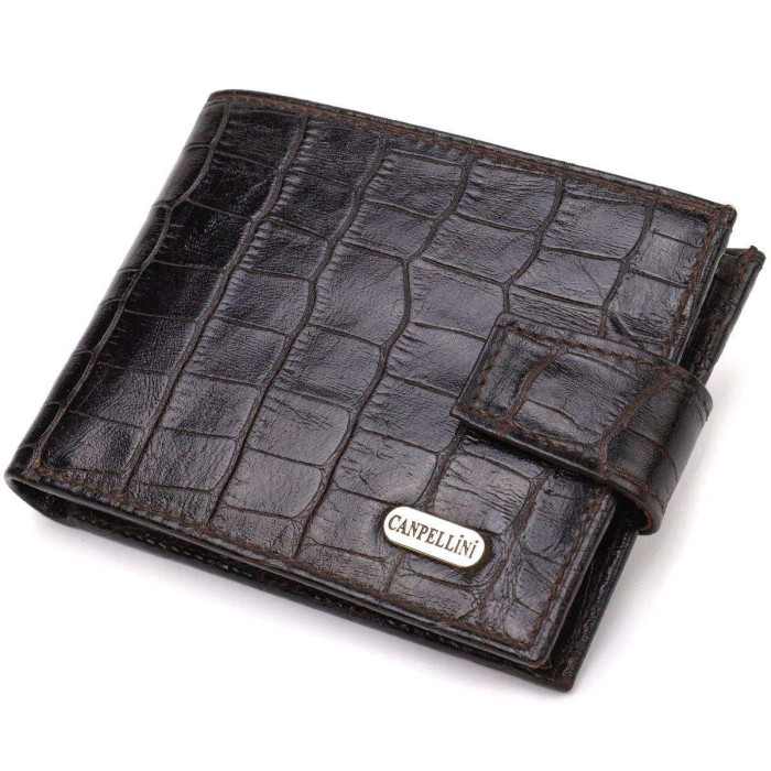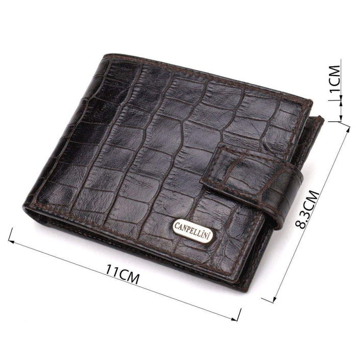 Модний чоловічий гаманець з натуральної фактурної шкіри з тисненням під крокодила. Аксесуар має одне основне відділення з перегородкою, в яке поміщаються купюри всіх номіналів, дев'ять кишень для карток, дві з яких під сіточкою, монетниця та дві прилеглі кишені. Закривається аксесуар хлястиком на кнопку. Колір фурнітури – срібло. Ви легко зможете помістити його в кишеню штанів чи маленьку сумку. Запакований гаманець картонну коробку. Шкіряний гаманець є чудовим подарунком для рідних та близьких людей.