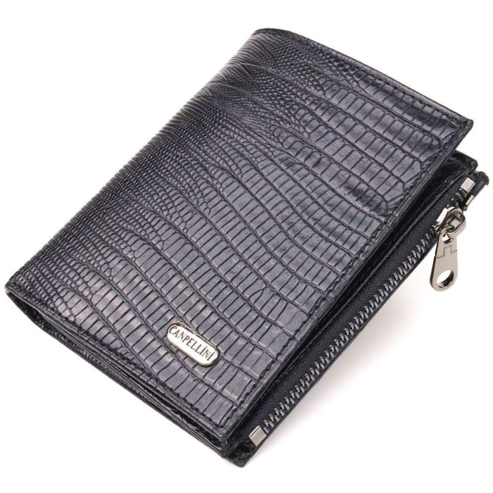 Стильний гаманець унісекс компактного розміру з натуральної шкіри, з тисненням під рептилію. Аксесуар має відділення для купюр, монетницю, що закривається на блискавку, дві приховані кишені та десять осередків для карток, один під сіточкою. Закривається аксесуар у два складання на кнопку. Якісний шкіряний аксесуар завжди вважався показником смаку та достатку, саме такі вироби представлені у нашому магазині, у нас кожен знайде щось для себе.