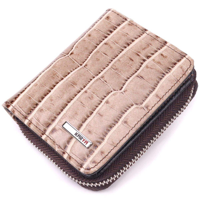Цікавий жіночий гаманець із натуральної фактурної шкіри, з тисненням під крокодила. Виріб складається з одного місткого відділення для купюр, чотирьох кишень, що прилягають, чотирьох слотів для карт і монетниці на блискавці. Складається аксесуар навпіл, з фіксацією кнопку. Якісна фурнітура доповнює та прикрашає виріб. Такий гаманець з натуральної шкіри - це ідеальний варіант на кожен день для тих, хто цінує якість, зручність та комфорт, а також чудово доповнюватиме Ваш повсякденний образ.
