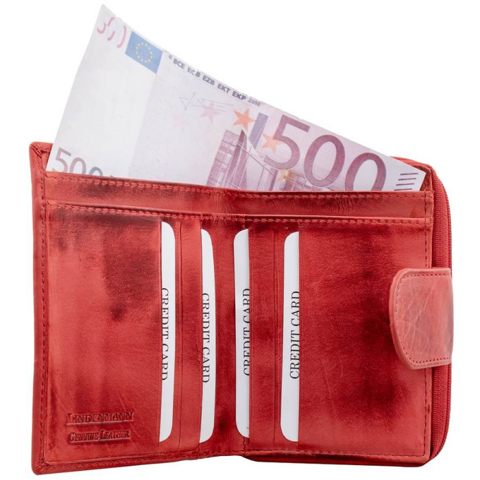 Кількість основних відділень (для купюр): 2. Відділення для візиток, банківських та дисконтних карток: 6. Відділення для дрібниці: 1. Кишеня-монетниця знаходиться окремо і закривається за допомогою блискавки (кишеню поділений на два відділення). Відділення для документів або фотокарток (з прозорим віконцем): 2 (відділення розташоване окремо від інших і закривається на механічну кнопку). Матеріал виробу: шкіра. Колір: червоний. Колір фурнітури: червоний. Розміри (X*Y*Z): 9,5*12*3 см. Ширина гаманця в розкритому вигляді – 18,5 см. Аксесуар закривається за допомогою хлястика на механічній кнопці. Виріб упаковано в картонну коробку. Країна походження торгової марки "Lindenmann" - Німеччина. Гарантія: 1 місяць.