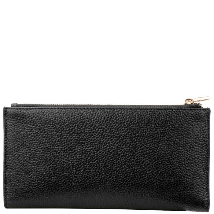 Цікавий пристрій доповнюється в цьому жіночому гаманці стильною, з елементами яскравості і тепла колірною гамою. Велика прямокутна модель має форму з чіткими контурами і строго прямими верхніми кутами, плавно згинається вона тільки по одній лінії. Виглядає виріб жіночно і по-діловому. Комбінування шкіри однакової фактури і різного кольору утворює привабливий чорно-коричневий ансамбль, де чималу роль грають ще й нечисленні деталі фурнітури з яскравим золотистим блиском. Модель торгової марки СМИТЭНДКАНОВА фіксується парою механічних кнопок у частині, призначеній для купюр, карт, малоформатного документа, а другий відсік, який однаково добре підходить для монет або банкнот, закривається блискавкою. У нашому магазині придбати високоякісний брендовий гаманець можна за вигідною ціною.