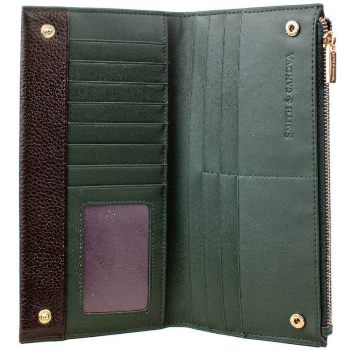Кількість основних відділень (для купюр): 2. Кількість додаткових відділень: 1. Відділення для банківських дисконтних і візитних карток: 13. Відділення для документів, фотокарт і перепусток: 1 (має прозоре віконце). Відділення для дрібниці: 1. Кишеня-монетниця закривається за допомогою блискавки. Матеріал виробу: шкіра. Колір: зелений, коричневий. Колір фурнітури: золото. Розміри (X*Y*Z): 22,5*10*0,5 см. Аксесуар закривається за допомогою механічної застібки. Виріб упаковано в фірмову картонну коробку. Країна походження TM Smith&Canova - Великобританія. Гарантія: 1 місяць.