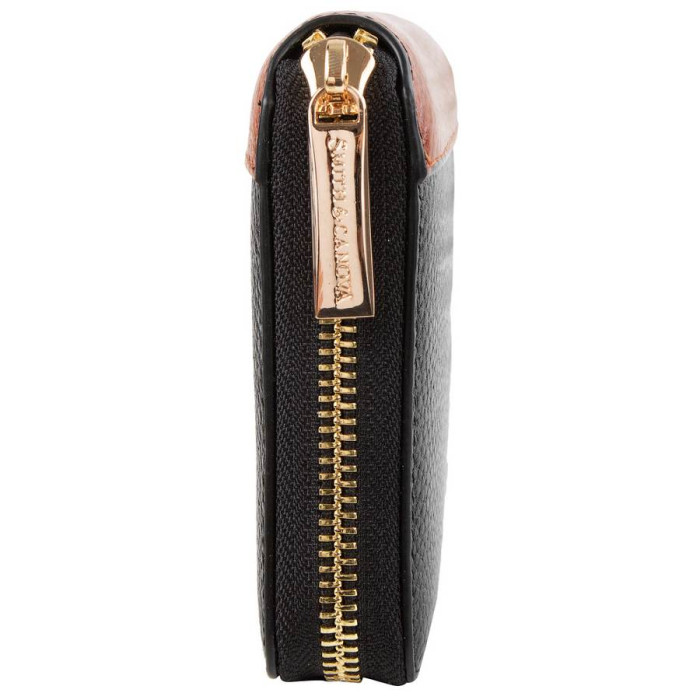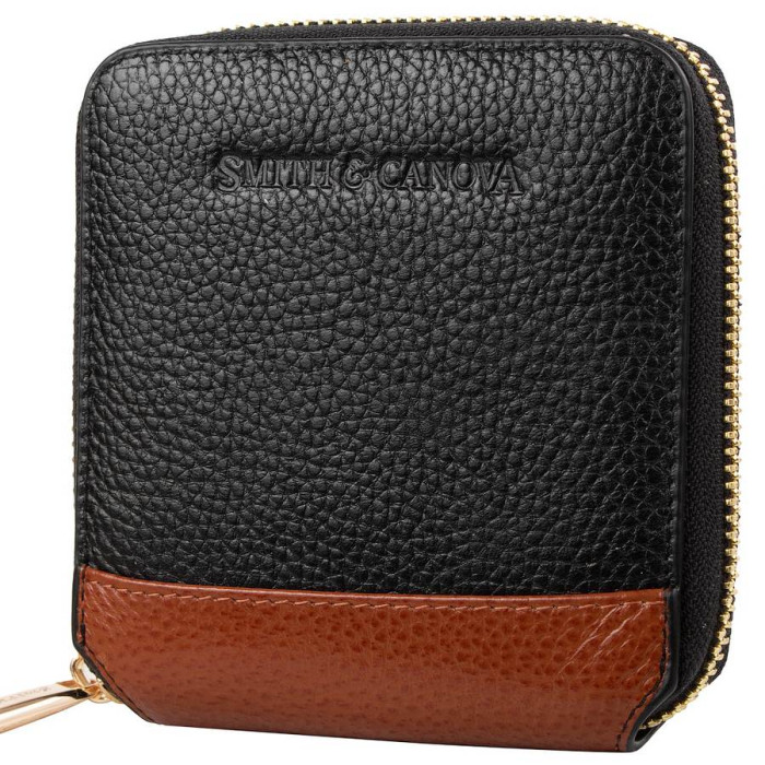 Кількість основних відділень (для купюр): 1. Додаткові відділення: 2. Відділення для візиток, банківських та дисконтних карток: 4. Відділення для дрібниці: 1. Закривається на механічну застібку. Матеріал виробу: шкіра. Колір: чорний, коричневий. Колір фурнітури: золото. Розміри (X*Y*Z): 9,5*10,5*2 см. Ширина в розкритому вигляді 21 см. Аксесуар закривається за допомогою блискавки. Виріб упаковано в фірмову картонну коробку. Країна походження ТМ Smith&Canova - Великобританія. Гарантія: 1 місяць.