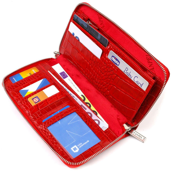 Яскравий жіночий клатч із натуральної лакованої шкіри, з тисненням під крокодила. Аксесуар має велике відділення для купюр, 15 осередків для карток (один під сіточкою), кишеню-перегородку на блискавці, три прилеглі кишені, кишеню з розширювачем на блискавці зовні та тримач для ручки. Носити цю модель зручно в руці або за допомогою знімного кистьового ременя. Закривається аксесуар на блискавку. Купуючи шкіряний аксесуар цієї фірми собі або на подарунок, будьте певні, що він радуватиме око не один рік.