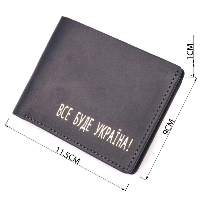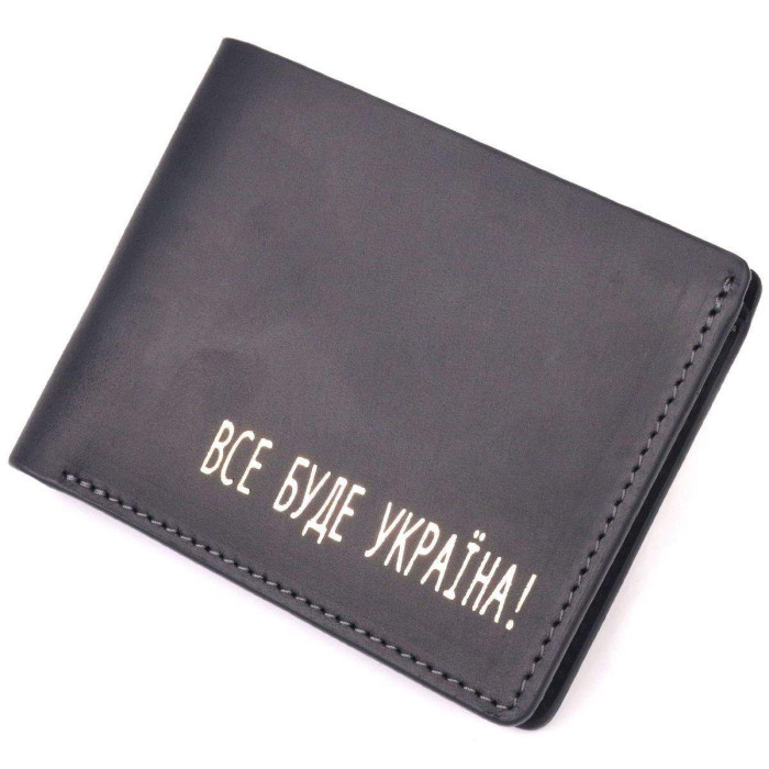 Багатофункціональний шкіряний гаманець чорного кольору з патріотичним написом “Все буде Україна”. Виріб пошитий із якісної вінтажної шкіри, з високими показниками зносостійкості. Портмоне має одне велике відділення для купюр усіх номіналів, а також достатню кількість відділень для карток, без застібки. Такий гаманець стане чудовим подарунком для рідних та близьких.