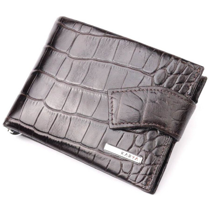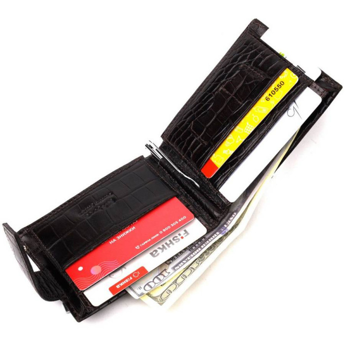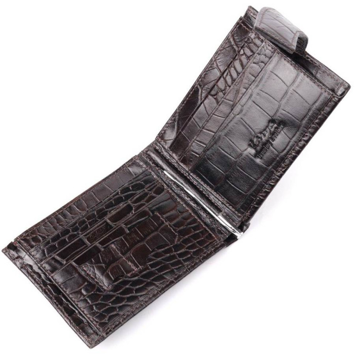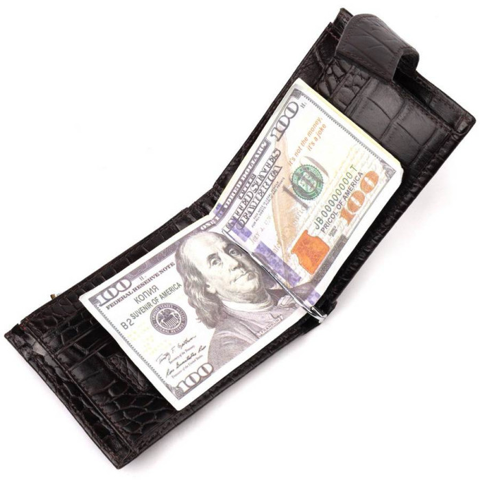 Зручний затискач для купюр виконаний із добротної натуральної шкіри, з тисненням під крокодила, коричневого кольору. Купюри фіксуються металевим утримувачем. Користь затиску полягає в тому, що він набагато компактніший, ніж гаманець, легко поміщається в руку або кишеню. Крім того, аксесуар надійніше та безпечніше закріплює гроші, тому краще вибрати саме його. Аксесуар упакований у фірмову коробочку. Вироби з натуральної шкіри завжди будуть чудовим подарунком для близької людини.