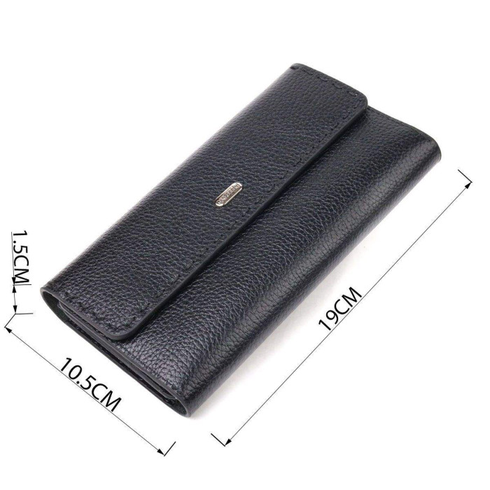 Стильний жіночий гаманець із натуральної зернистої шкіри. Аксесуар має три відділення для купюр, монетницю, що закривається на блискавку, дві приховані кишені та дванадцять кишень для карток. Закривається аксесуар клапаном на магніти. Краї клапана декоровані рівним прошитим рядком у колір виробу. Якщо Ви хочете порадувати себе та здивувати близьких, то неодмінно купуйте шкіряні аксесуари в нашому магазині, якість і ціна Вас однозначно порадує.