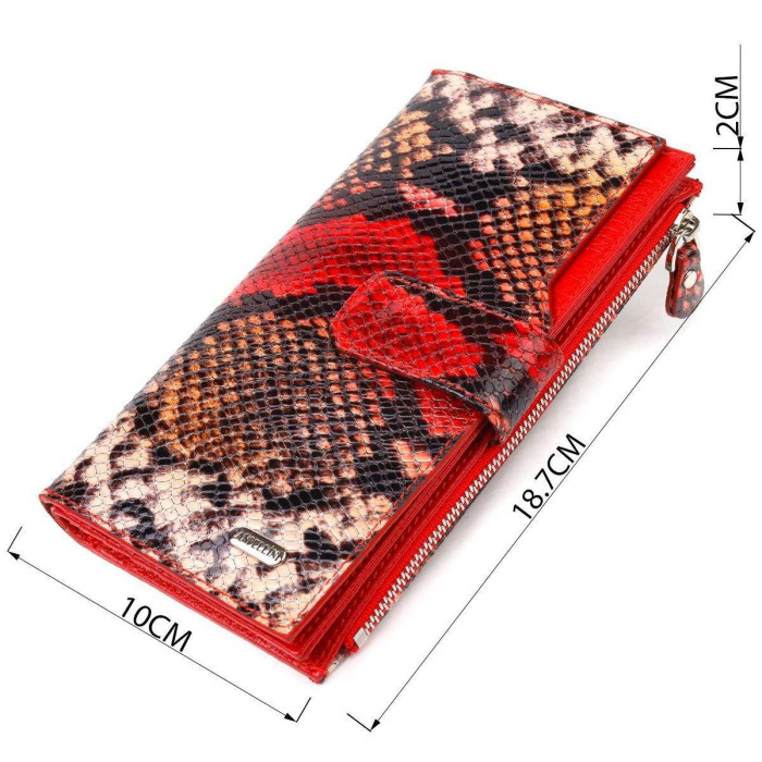 Цікавий жіночий гаманець з натуральної фактурної шкіри з тисненням під змію. Аксесуар має шість прилеглих кишень, у які помістяться купюри всіх номіналів, містку монетницю та двадцять кишень для карток. Закривається аксесуар хлястиком на кнопку. Якщо Ви хочете порадувати себе та здивувати близьких, то неодмінно купуйте шкіряні аксесуари в нашому магазині, якість і ціна Вас однозначно порадує.