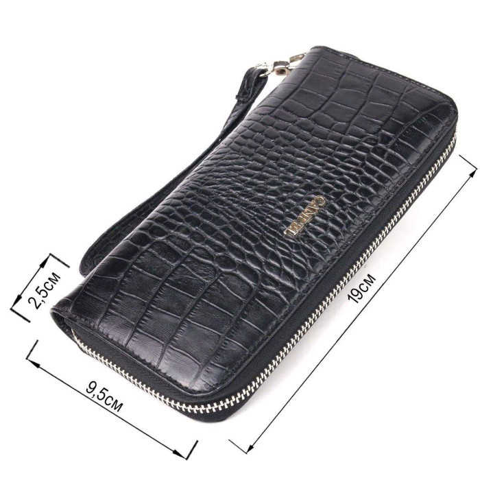 Стильний жіночий гаманець з натуральної фактурної шкіри в класичному чорному кольорі. Аксесуар має три основні відділення, в які поміщаються купюри всіх номіналів, дві перегородки, одна з них на блискавці, вісім кишень для карток, дві прилеглі кишені та знімний кистьовий ремінь. Закривається аксесуар на блискавку. Відмінний аксесуар, надійного виробника, який прослужить дуже довго.