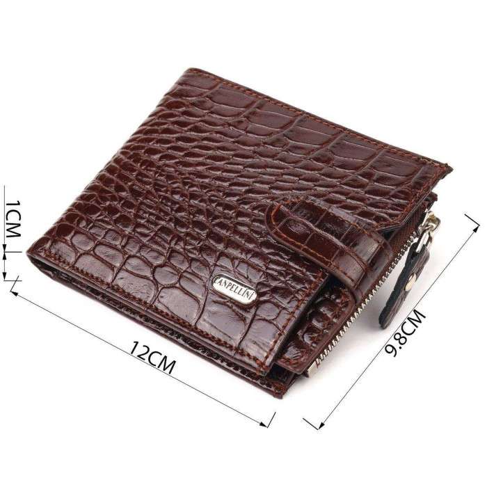 Функціональний гаманець для чоловіків з натуральної фактурної шкіри з тисненням під крокодила. Аксесуар має одне основне відділення з перегородкою, до якого вміщуються купюри всіх номіналів, дев'ять кишень для карток, дві з яких під сіточкою, монетницю на блискавці, п'ять прилеглих кишень, а також автономний блок для карт, який розташований в одній із прилеглих кишень. Закривається аксесуар хлястиком на кнопку. Колір фурнітури – срібло. Шкіряний гаманець є чудовим подарунком для рідних та близьких людей.