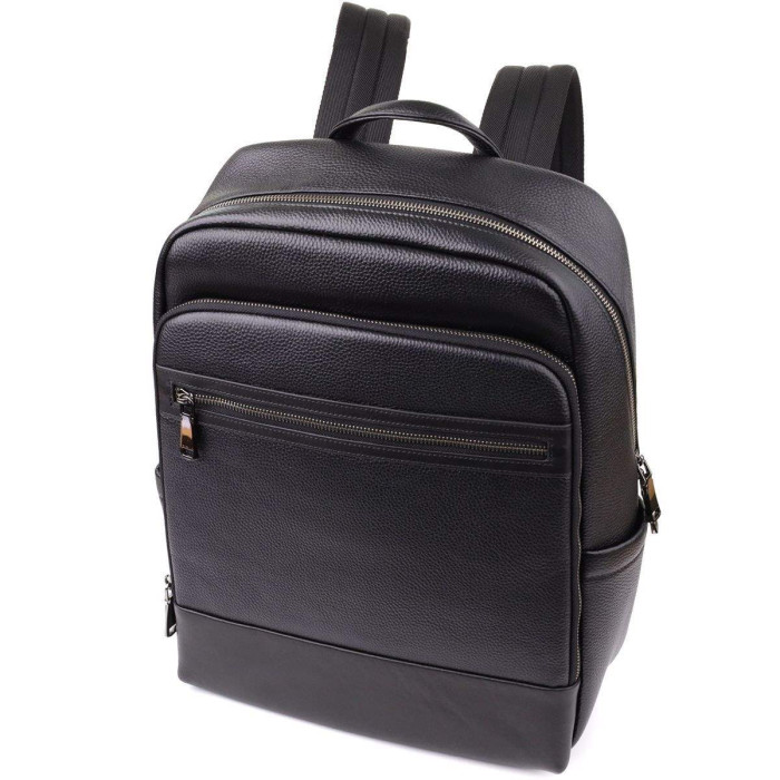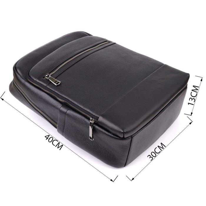 Стильний шкіряний рюкзак виконаний з натуральної шкіри з виразною текстурою та оснащений одним основним відділенням на блискавці з двома бігунками, що забезпечує зручний доступ та місткість. Усередині знаходяться дві відкриті кишені для зручної організації дрібних речей. На лицьовій стороні розташовані накладна та вбудована кишені, що закриваються на блискавці. Для комфортного перенесення передбачена шкіряна ручка, м'які лямки, що регулюються, і ортопедична спинка, яка знижує навантаження на хребет при тривалому носінні. Фурнітура виконана в кольорі темного срібла, підкреслюючи стиль та елегантність моделі. Цей рюкзак стане надійним та зручним супутником у повсякденному житті.
