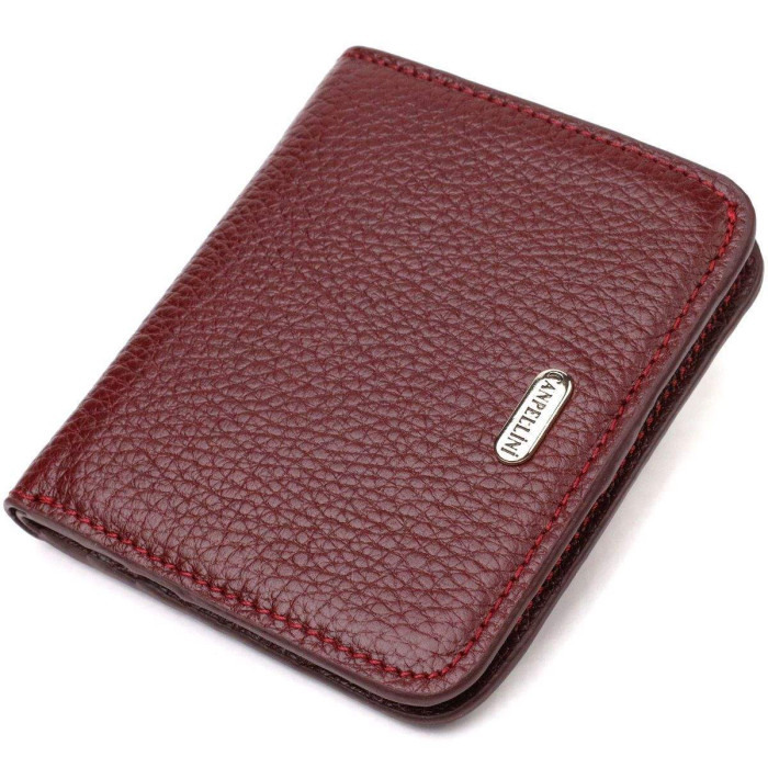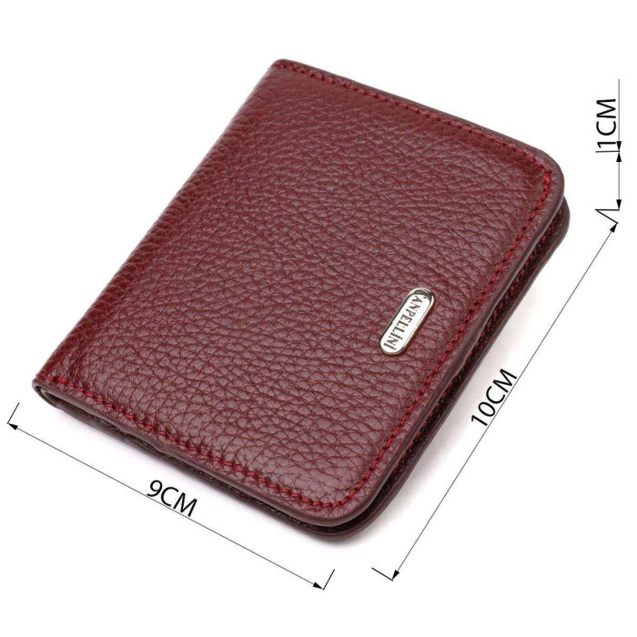Цікавий компактний гаманець із натуральної зернистої шкіри, для суперстильних дівчат та жінок. Аксесуар має одне основне відділення з тканинною перегородкою в яке поміщаються купюри всіх номіналів, п'ять кишень для карток (одна під сіточкою), дві приховані кишені та монетницю. Закривається аксесуар навпіл на кнопку. На лицьовій стороні, вгорі посередині металевий логотип компанії виробника. Купуючи шкіряний аксесуар цієї фірми, собі чи на подарунок, будьте певні, що він прослужить Вам не один рік.