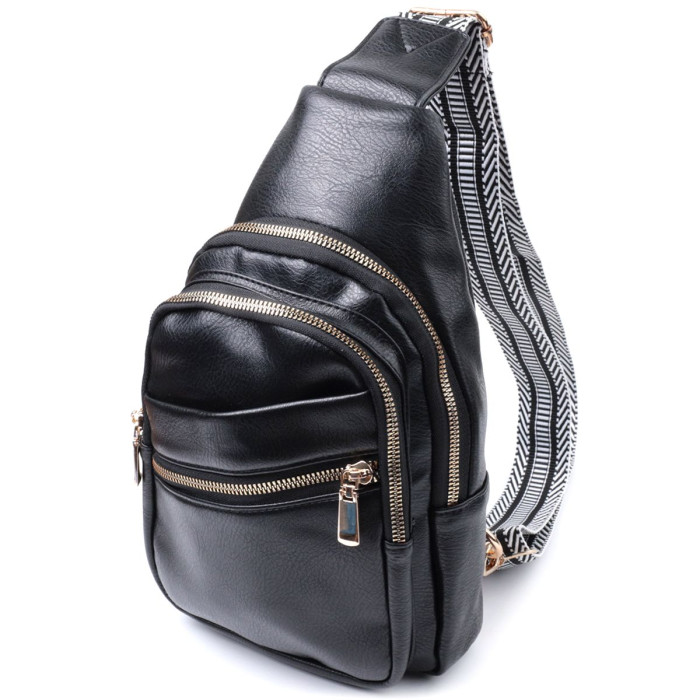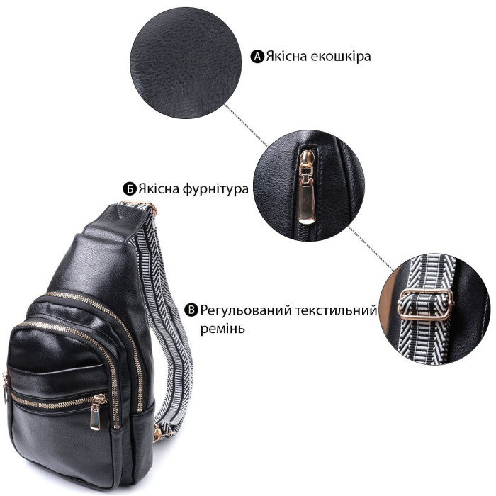 Пропонуємо до Вашої уваги зручну слінг сумку з екошкіри класичного чорного кольору. Дана модель складається з одного основного відділення, яке закривається на блискавку і в якому знаходиться кишеня на блискавці та кишеня відкритого типу всередині, а також чотирьох кишень зовні та одного отвору для кабелю або навушників, що дуже зручно в сучасному світі. Основною фішкою моделі є зручний регульований плечовий ремінець у етнічному стилі, що дуже модно вже кілька сезонів. Екошкіра – високоякісна альтернатива натуральному матеріалу, яка дуже стійка до тертя, до низьких температур, відмінно носиться на відміну від інших штучних матеріалів, а також має гіпоалергенний склад на відміну від натуральної шкіри.