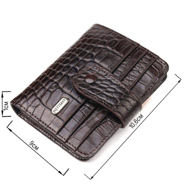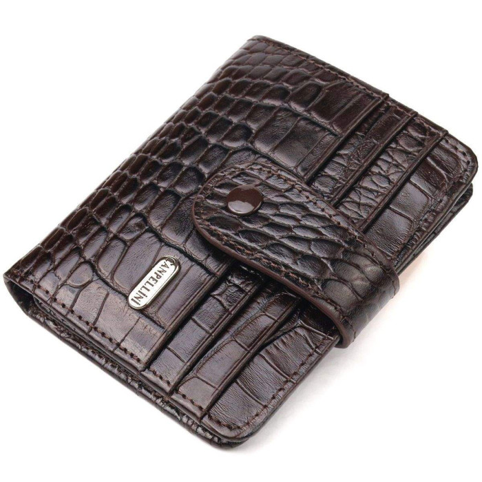 Стильний чоловічий гаманець-картхолдер з натуральної фактурної шкіри з тисненням під крокодила. Аксесуар має відділення для купюр, приховану кишеню та п'ятнадцять відсіків для карток, два з них під сіточкою. Закривається аксесуар у два складання хлястиком на кнопку. Якісний шкіряний аксесуар завжди вважався показником смаку та достатку, саме такі вироби представлені у нашому магазині, у нас кожен знайде щось для себе.