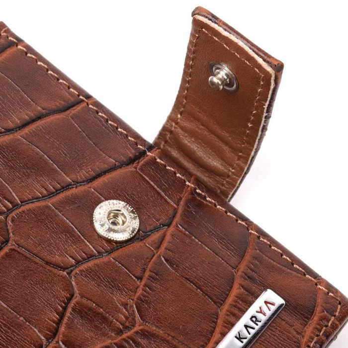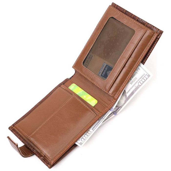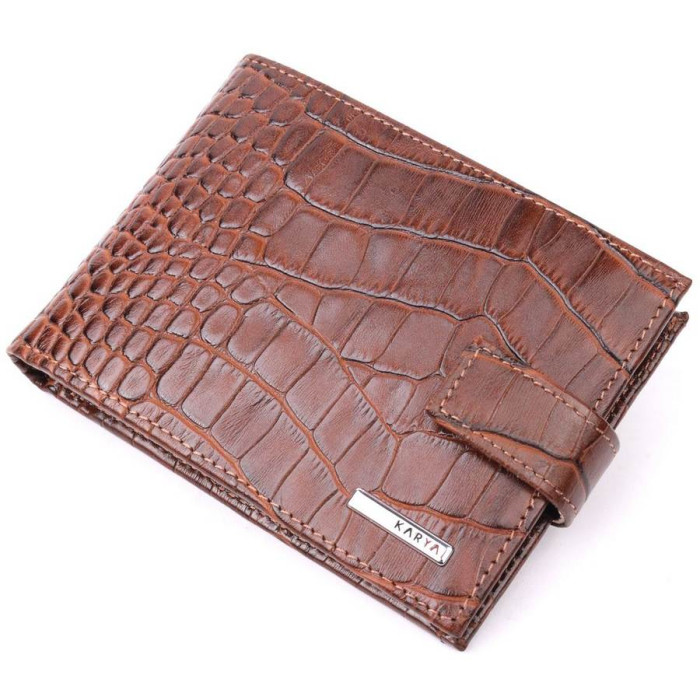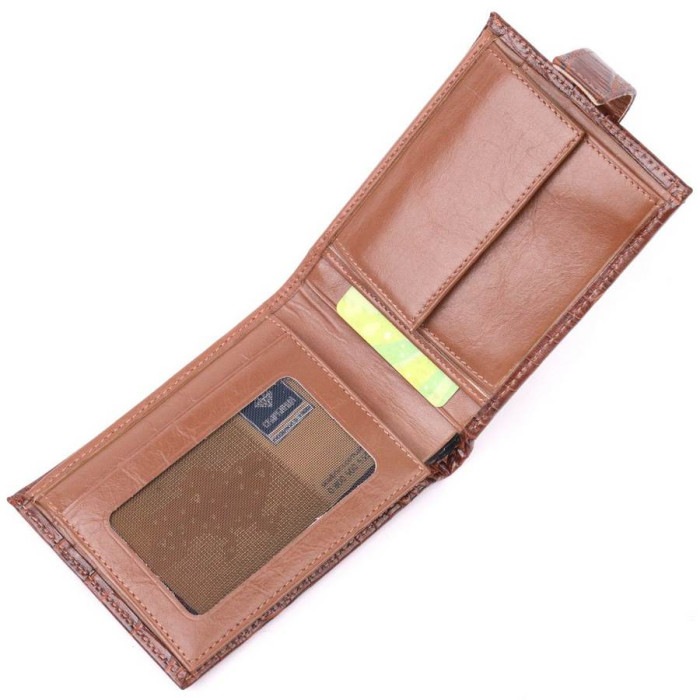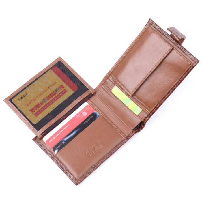 Практичний чоловічий гаманець із натуральної фактурної шкіри, з тисненням під крокодила, у коричневому кольорі. Виріб закривається на хлястик із кнопкою. На лицьовій стороні у вигляді декору розташований металевий логотип виробника. Аксесуар упакований у фірмову коробочку. Вироби з натуральної шкіри завжди будуть чудовим подарунком для близької людини.