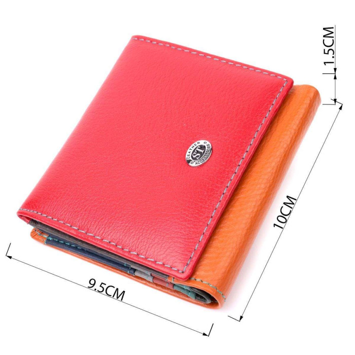 Жіноче яскраве портмоне в два складання з натуральної шкіри найвищої якості. Фішкою цього гаманця є його багатобарвна гама, такий аксесуар одразу впадає у вічі, складається він з двох містких відділень для купюр, шести осередків для карт, двох прихованих кишень та кишені для монет. Зовні виріб прошитий рівним рядком бірюзового кольору по краю і прикрашений металевим логотипом компанії виробника. Портмоне доповнено надійною фурнітурою та міцною підкладкою. Укомплектований гаманець у фірмову картонну коробку білого кольору.