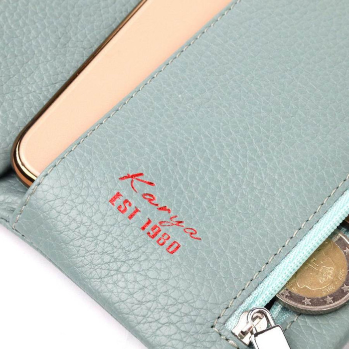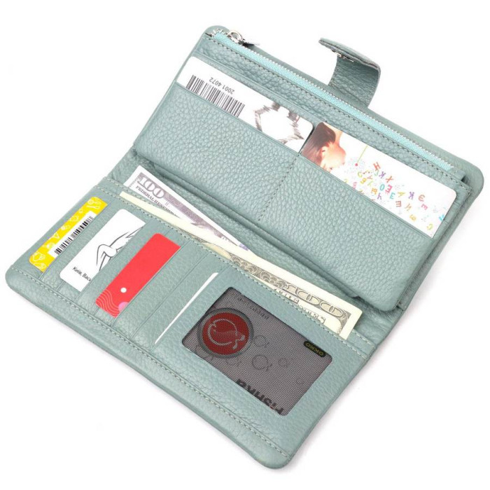 Чудовий жіночий гаманець із натуральної зернистої шкіри, в гарному бірюзовому кольорі. Внутрішній розворот складається з чотирьох відкритих відділень для купюр, однієї кишені з розширювачем на застібці, однієї прихованої кишені на блискавці, однієї кишені-перегородки на блискавці, однієї сітчастої кишеньки та дванадцяти секцій для пластикових карток. Складається аксесуар навпіл, з фіксацією на хлястик із магнітом. Такий гаманець з натуральної шкіри – це ідеальний варіант на кожен день для тих, хто цінує якість, зручність та комфорт.