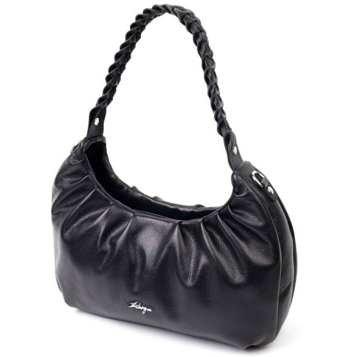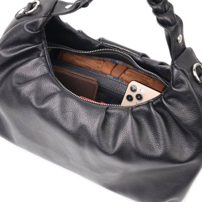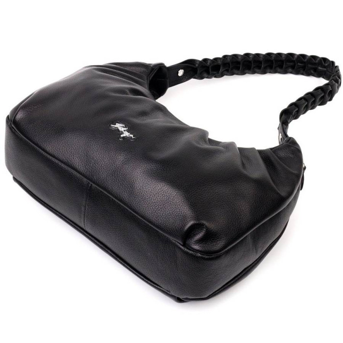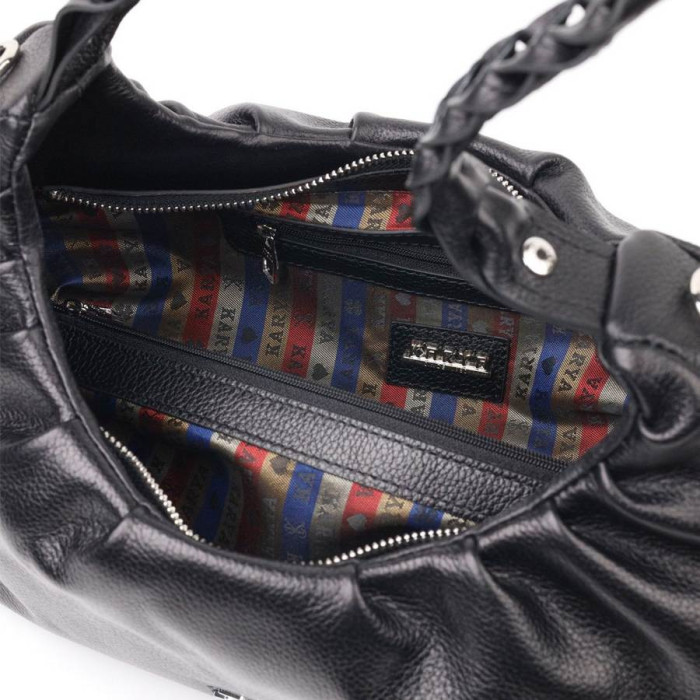 Чудова сумка-багет середнього розміру з натуральної крупнозернистої шкіри в класичному чорному кольорі. Виріб має надійну плетену ручку для перенесення в руці, а також знімний шкіряний і регульований по довжині, плечовий ремінь. Сумка функціональна та зручна в експлуатації, виріб має якісну фурнітуру сріблястого кольору та міцну підкладку. Аксесуар упакований у фірмовий текстильний мішок Karya. Сумка з натуральної шкіри завжди буде чудовим подарунком будь-якій жінці.