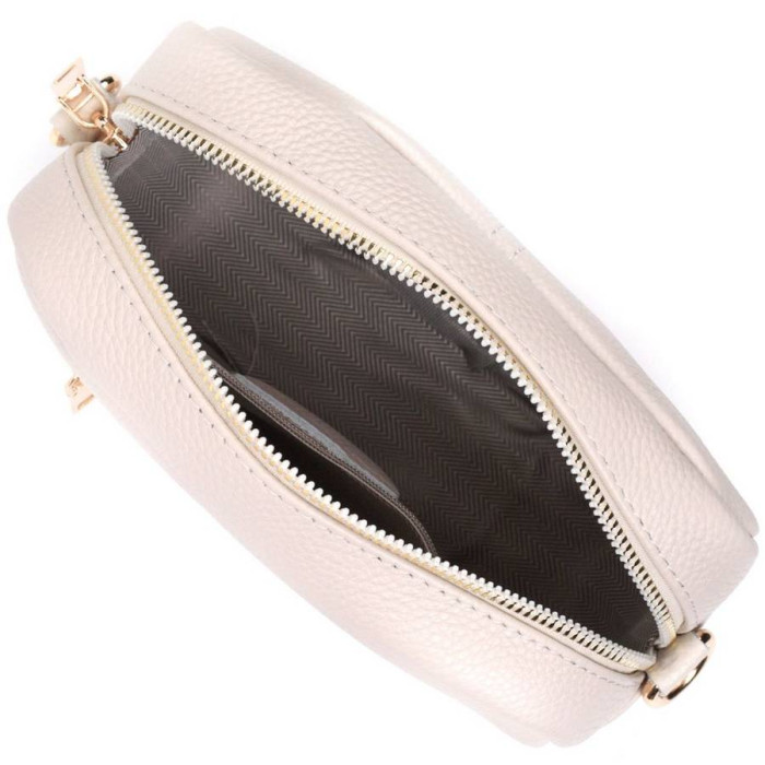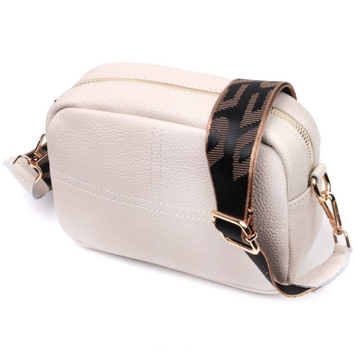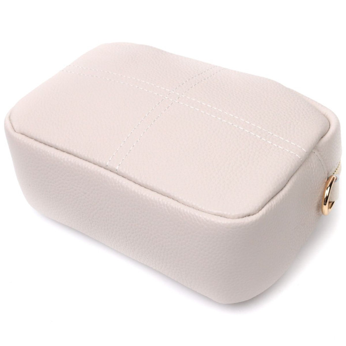 Жіноча прямокутна сумка на плече з натуральної шкіри з високим показником якості та зносостійкості. На лицьовій стороні сумки присутній декоративний подвійний хрестоподібний рядок, що надає виробу своєї родзинки та неповторного стилю. Аксесуар складається з основного відділення, що закривається на блискавку, всередині якого знаходиться потайна кишеня на блискавці та кишеня відкритого типу, а також зовнішня кишеня на блискавці на тильній стороні. Носити сумку можна на плечі і через плече, для цього є текстильний ремінь, що знімається. У виробі використано якісну фурнітуру кольору жовтого золота. Універсальний варіант сумки як на вечір, так і як сумочка на кожен день.
