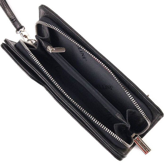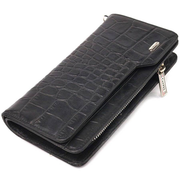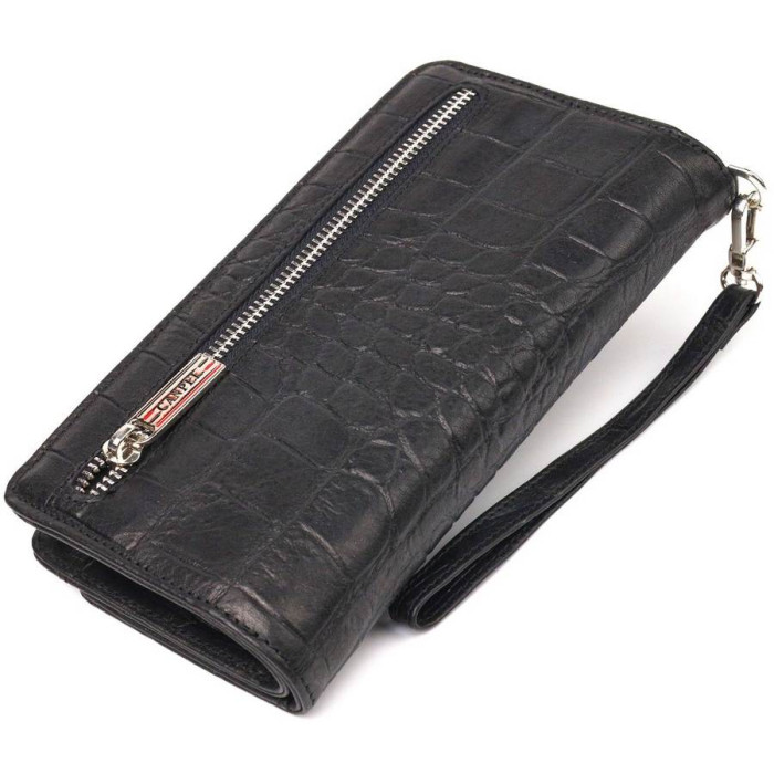 Практичний гаманець-клатч, з натуральної фактурної шкіри, з тисненням під крокодила. Аксесуар має одне основне відділення, в яке поміщаються купюри всіх номіналів, дванадцять кишень для карток, одна з яких під сіточкою, блок для карт із зовнішнього боку, дві кишеньки на блискавці, знімний кистьовий ремінь. Закривається аксесуар на блискавку, а блок для карток закривається на кнопки. Колір фурнітури – срібло. Шкіряний гаманець є дивовижним подарунком для близької людини.