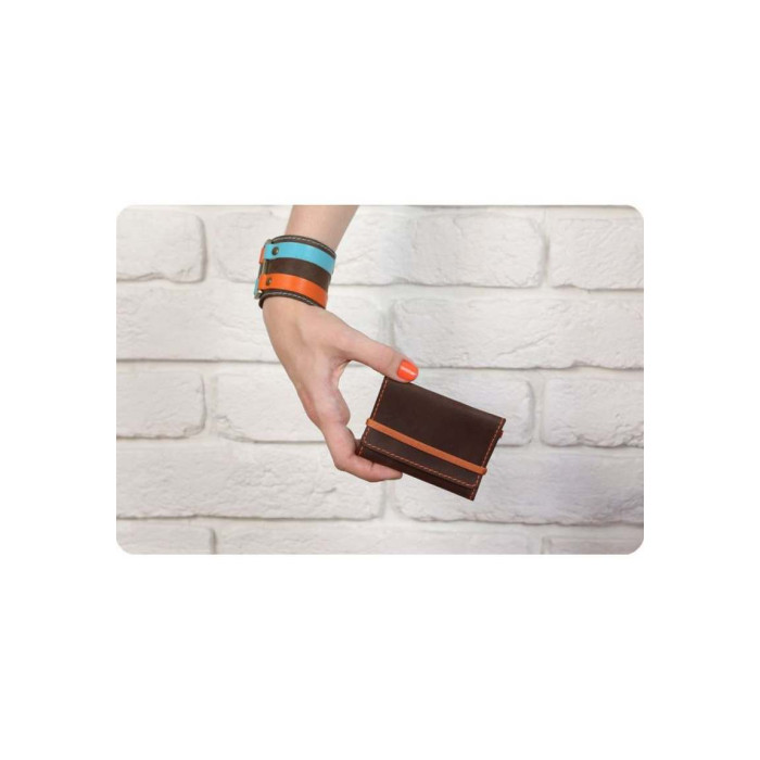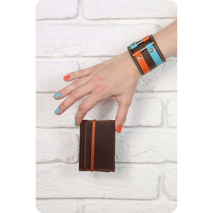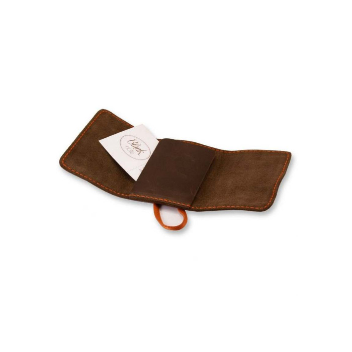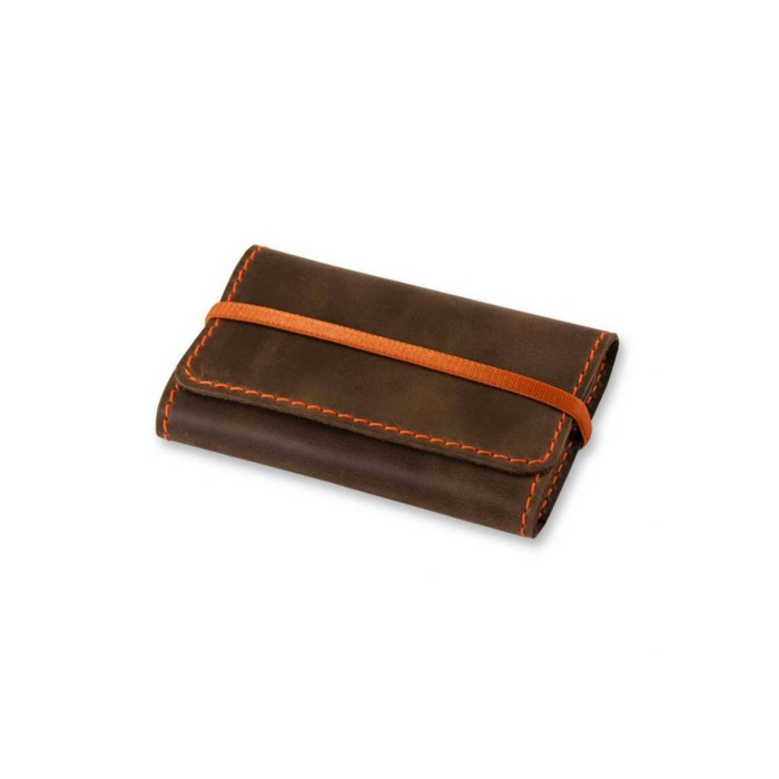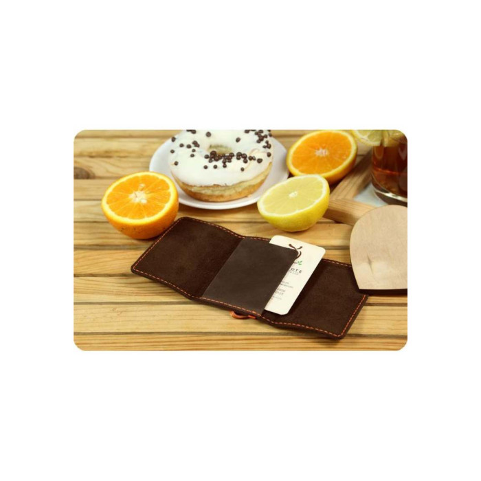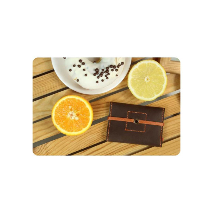 Кейс виготовлений повністю вручну з цільного шматка шкіри. Закривається виріб на гумку, закріплену люверсом. Всередині знаходиться допоміжний клапан, який покращує фіксацію карт.