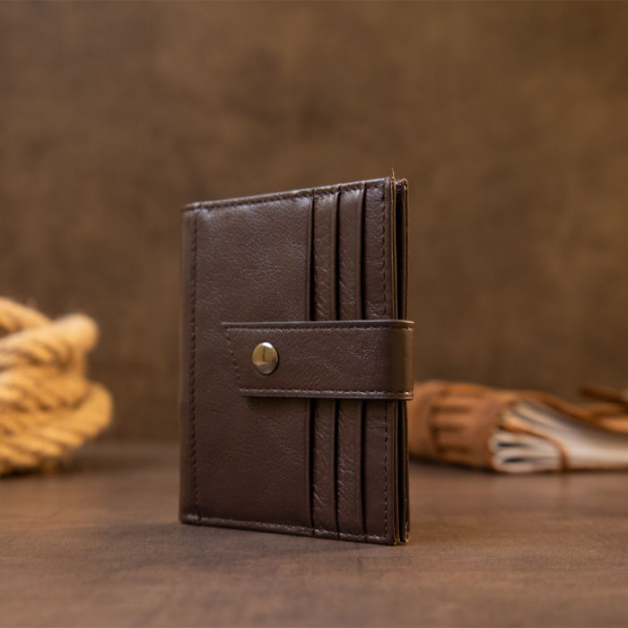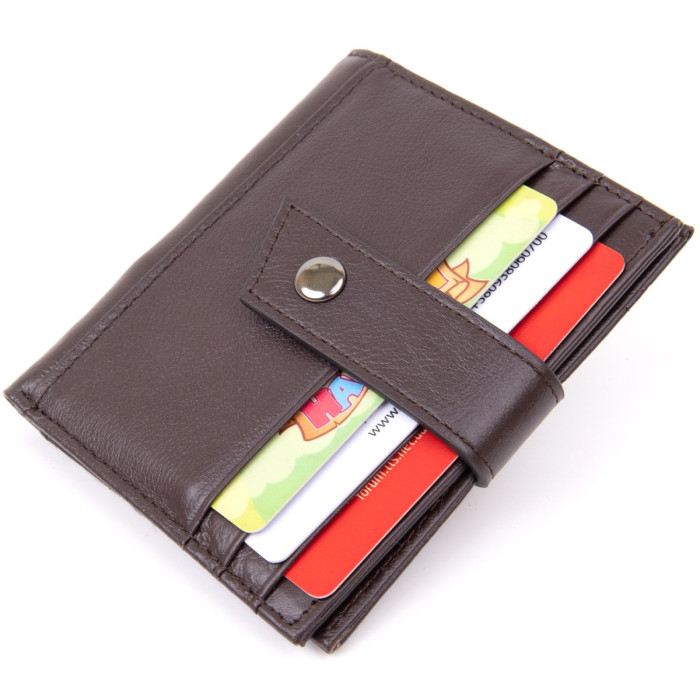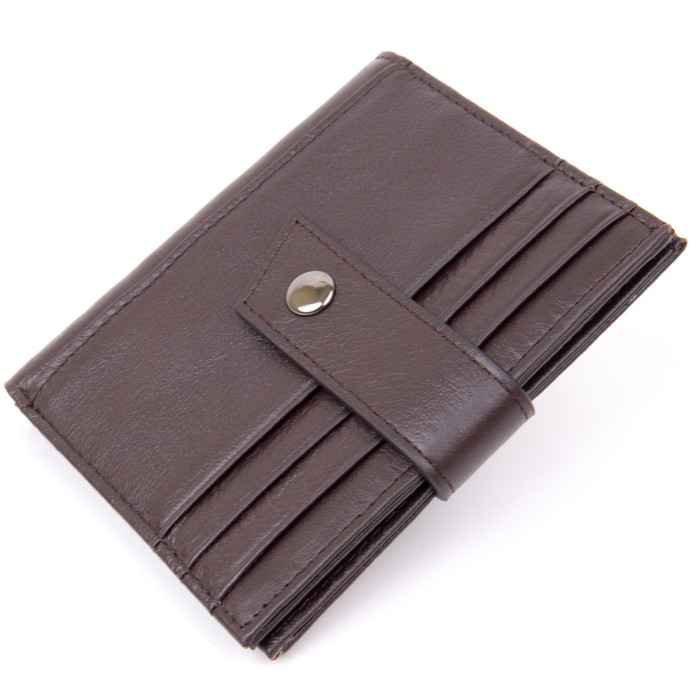 Тонкий картхолдер мінімального розміру. Виріб виконаний з натуральної шкіри високої якості. Закривається портмоне на хлястик з кнопкою. Модель має 12 осередків під кредитки. Аксесуар з легкістю поміститься в кишеню брюк або маленьку сумку. У комплекті йде пилозахисний чохол.